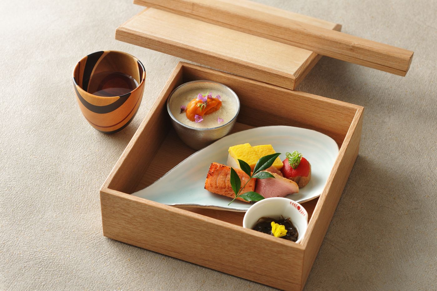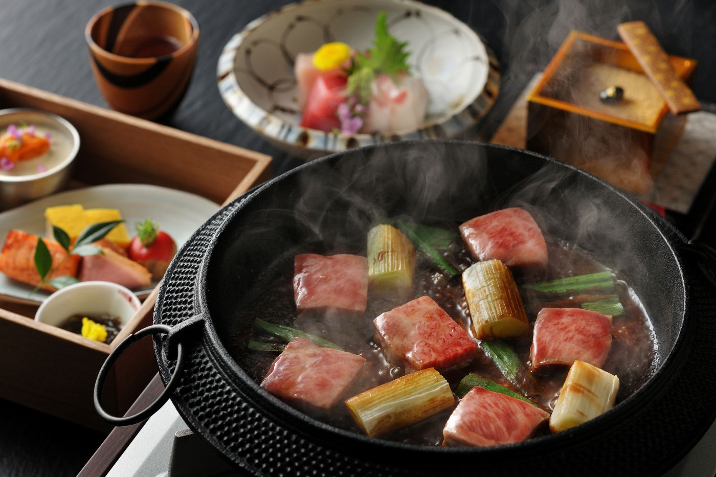 「界 箱根」以箱根歷史為靈感,設計出「明治牛肉鍋會席」。開胃菜盛裝於靈感源自旅人行李「夾箱」的木盒中,包含以箱根峠甜酒製成的甘酒濃湯與當季小菜;主菜則是厚切牛肉搭配味噌湯底的明治牛肉鍋,呼應明治時期箱根作為溫泉療養地、迎來西式飲食文化的歷史背景。