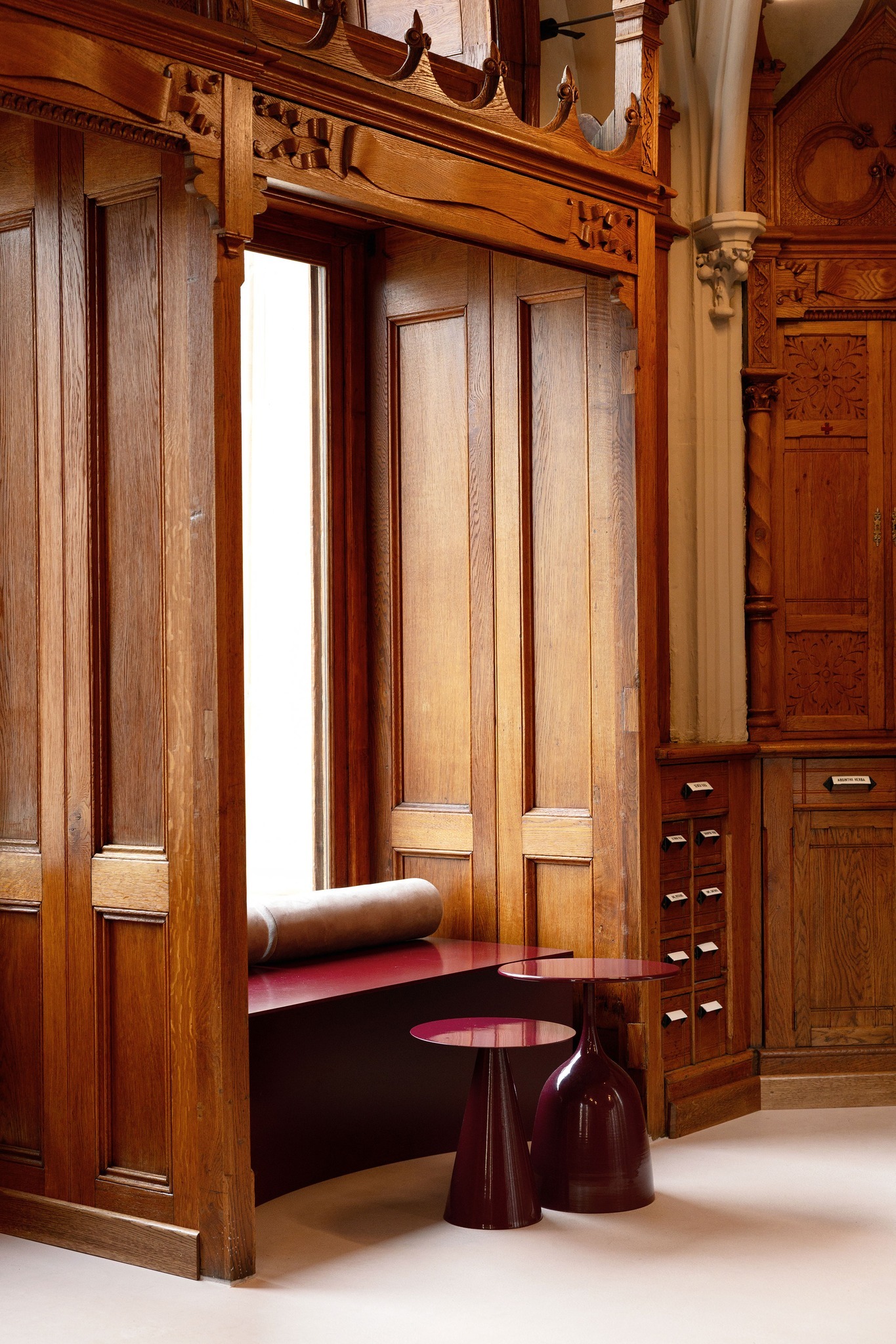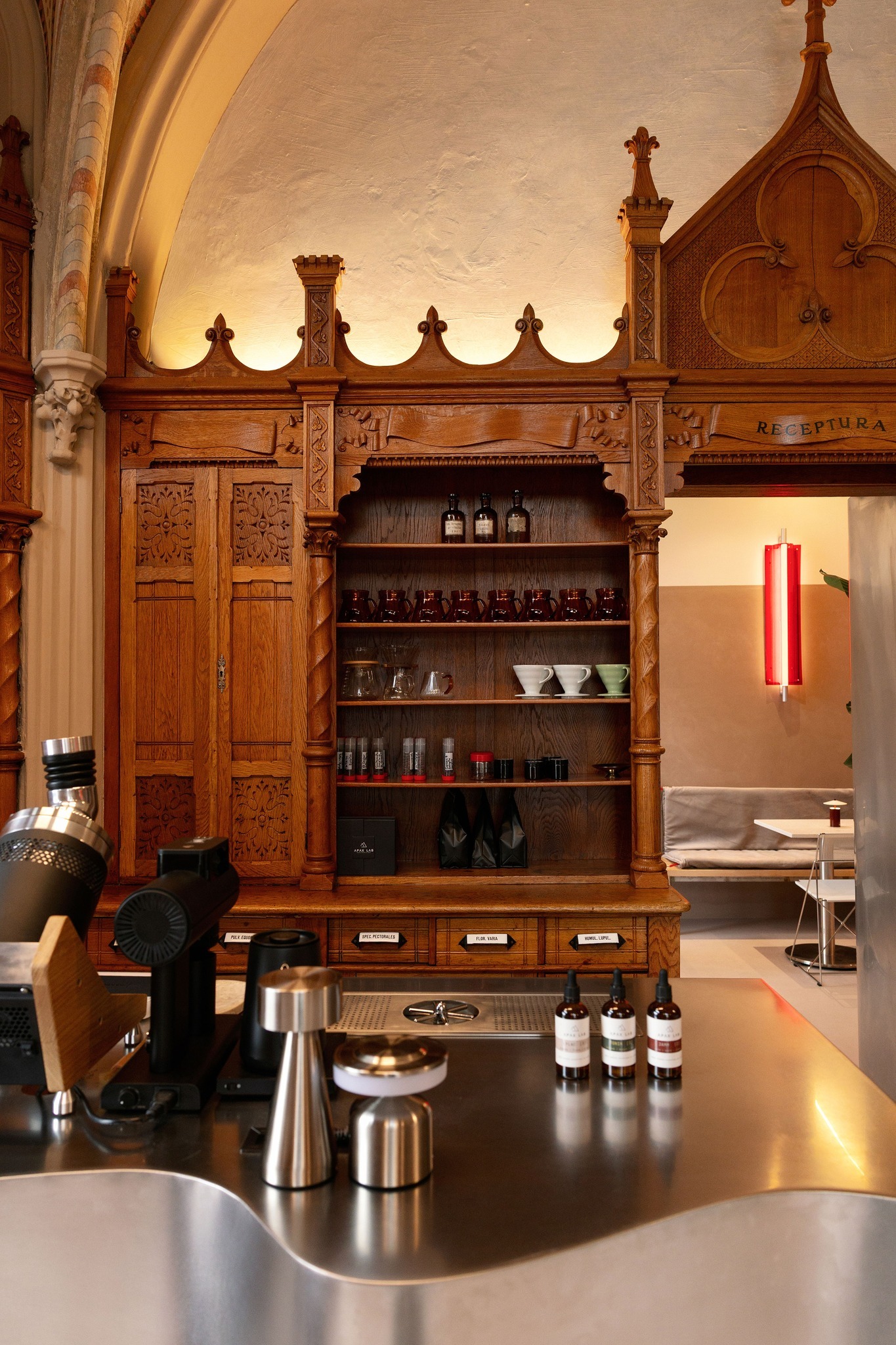 空間裡最迷人的,莫過於那些新哥德式木作藥櫃。由木匠 B. Bak Lajos 製作的櫃體沿牆排列,雕刻細緻、節奏密實,拱形天花與尖拱結構在其上方層層展開,構成一種既莊嚴又秩序分明的室內風景。設計團隊並沒有試圖拿掉這段歷史,而是選擇退一步,將修復與保存作為設計的第一步,讓這些老物件成為空間真正的主角。