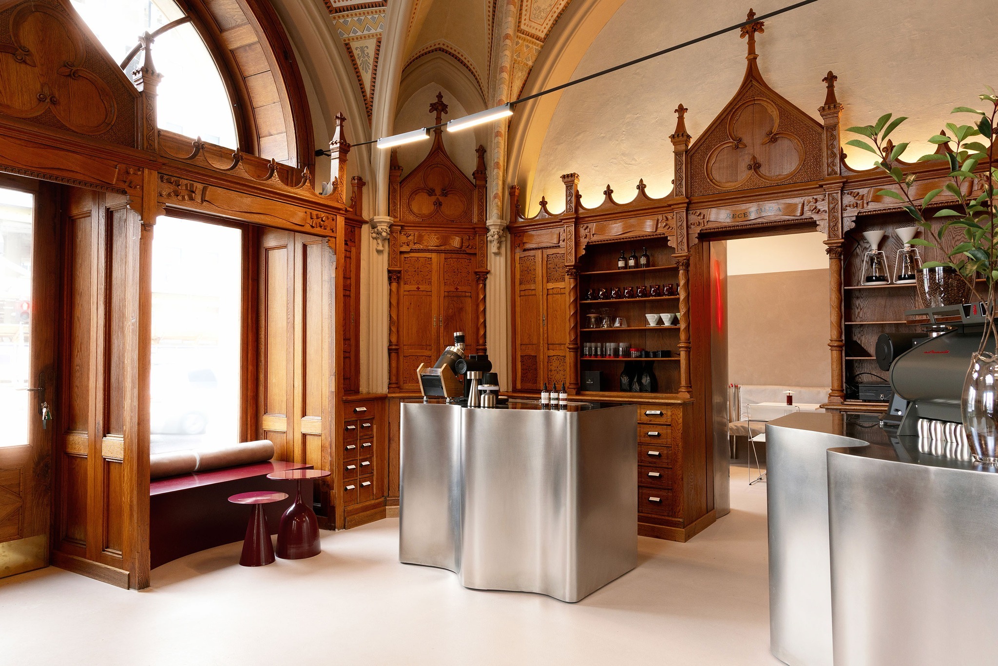 百年老藥房變身咖啡館:紅色長椅和拱頂木作交織,羅馬尼亞 Laboratorium Café 亮相