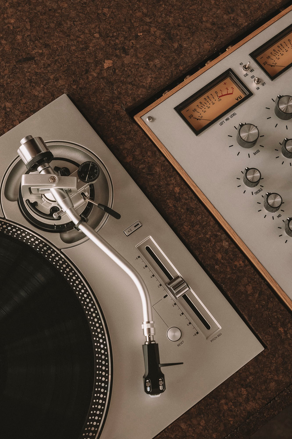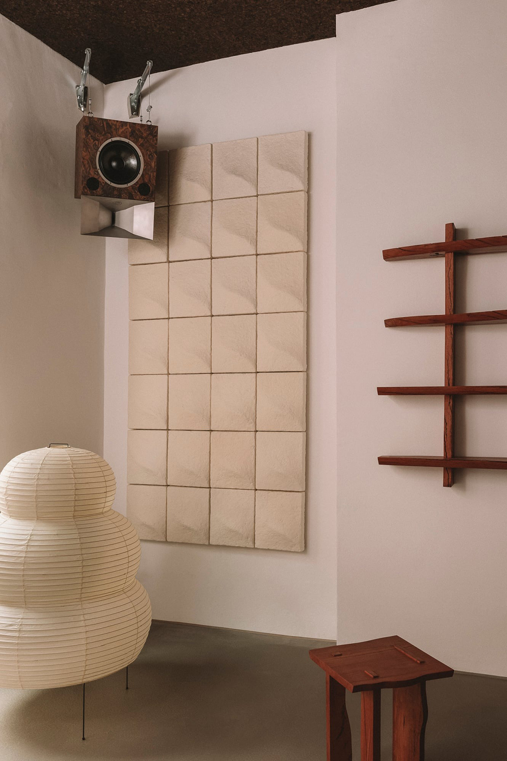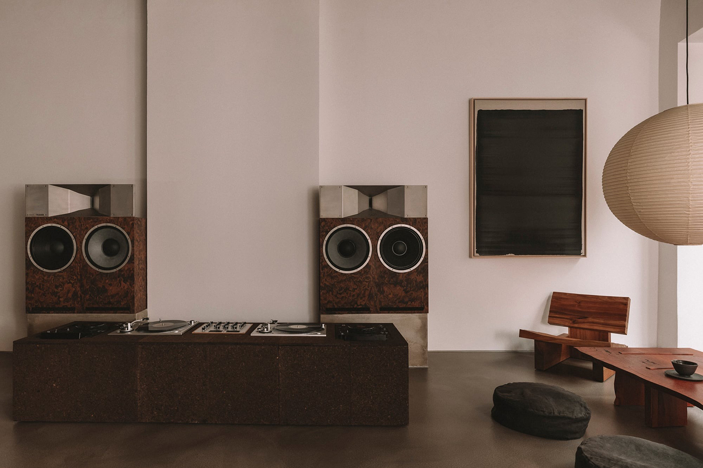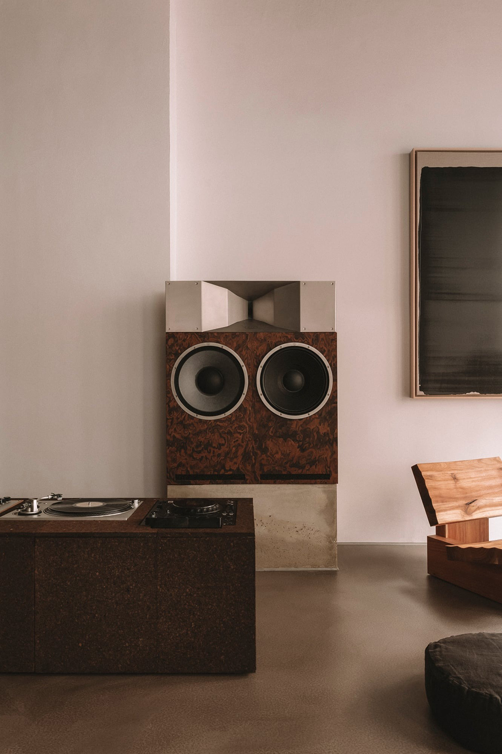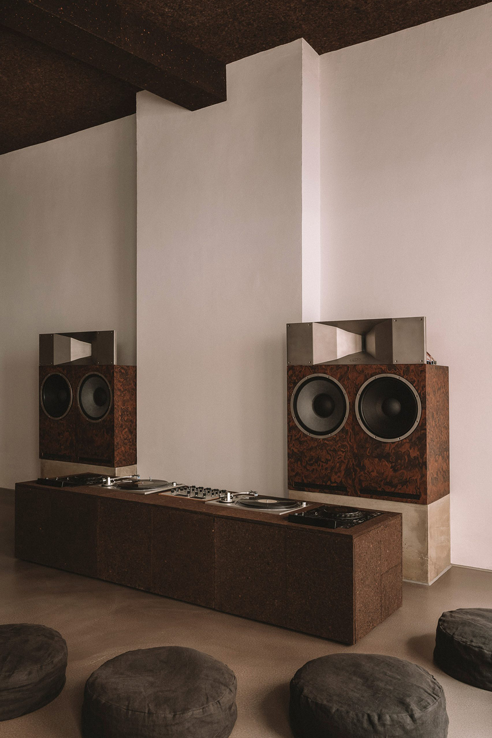 材料選擇上,低碳且具備良好吸音效果的軟木成為關鍵元素。燒製深色的軟木包覆著 DJ 台與天花板,協助調節空間聲學,同時帶來溫潤而內斂的視覺感受。DJ 台後方,與柏林音響團隊 H.A.N.D. HiFi 共同開發的客製化系統,則讓巨型喇叭如同建築構件般融入空間,巧妙地成為一道迷人的室內風景。