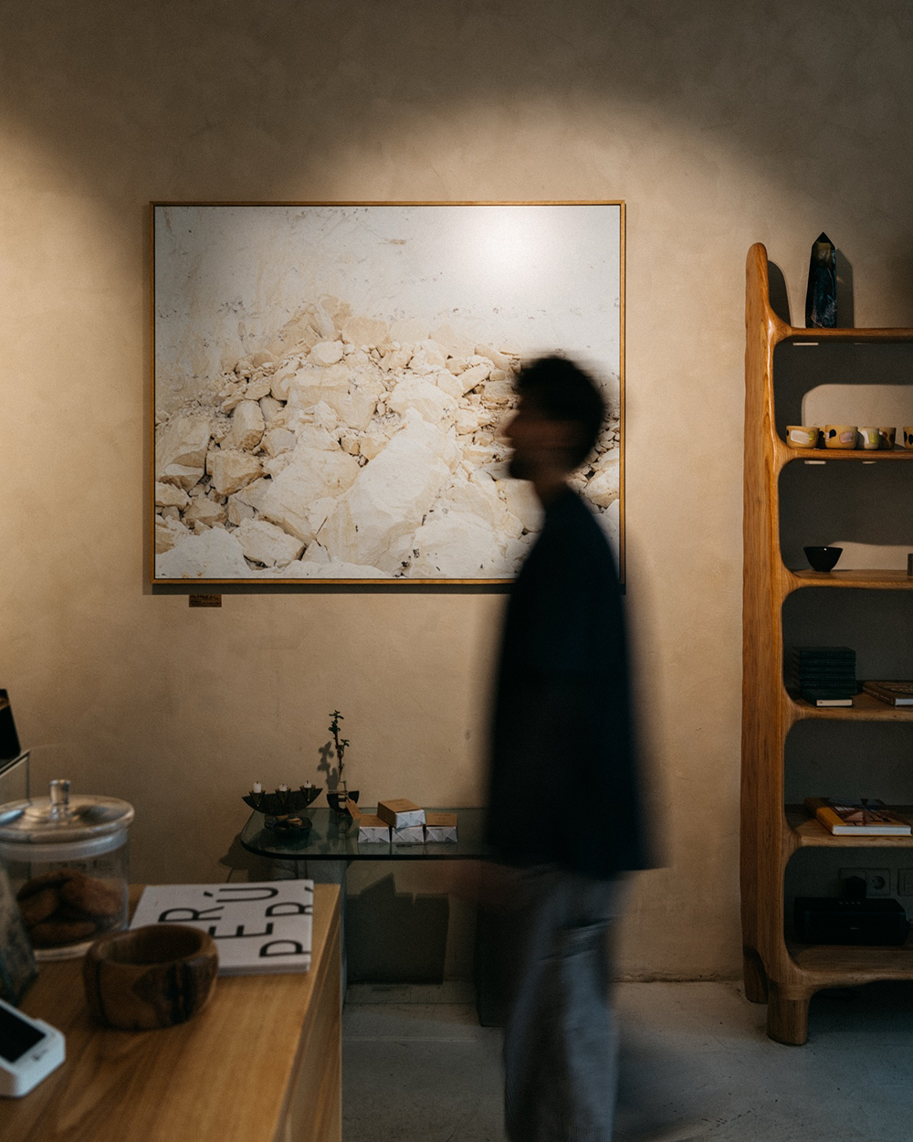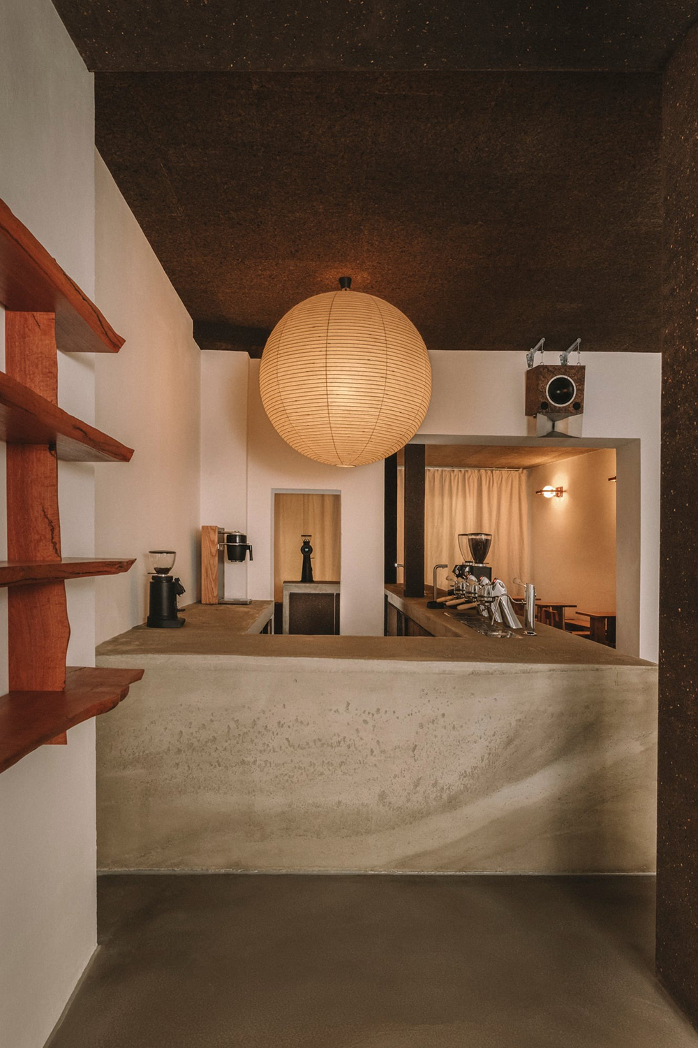 空間中央,現場澆築的混凝土吧台以粗獷的表面質地,與 La Marzocco Modbar 櫥下型咖啡機的金屬質感形成對比。家具選用里斯本品牌 Further THER 打造的低矮木製桌椅,其比例與細膩的工藝,呼應日本木作的內斂精神;點綴的野口勇 Akari 燈具則散發柔和光線,配上素色布簾、菌絲體聲學牆面與藝術品等細節,讓整體氛圍顯得安靜而富有層次。