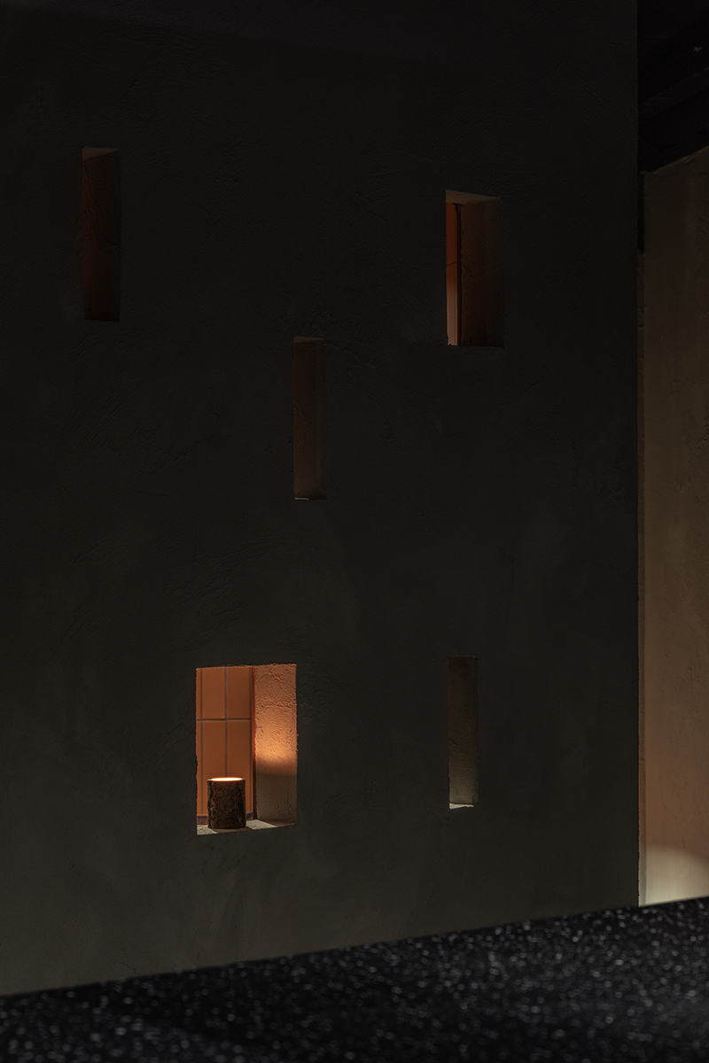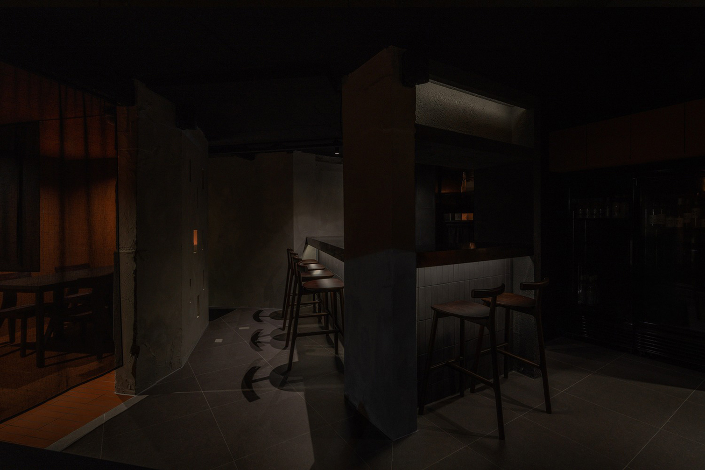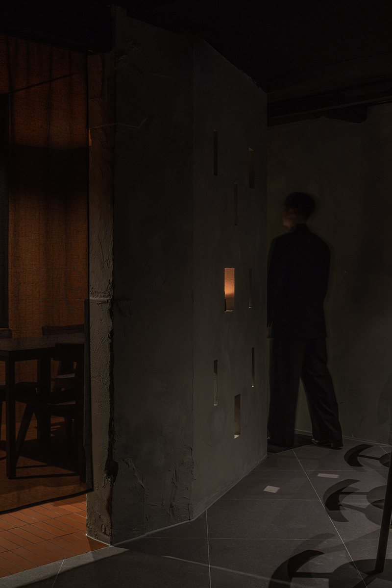 包廂空間中運用了帶有透感的深色窗簾,巧妙地區隔座位區域,在保有隱私的同時,仍讓光線得以流動。分隔吧檯與包廂的牆體上,則挖鑿出不規則排列的孔洞,微光從中滲出,增添趣味,也緩解了小尺度空間可能帶來的壓迫感,讓人始終能感受到空間的呼吸。