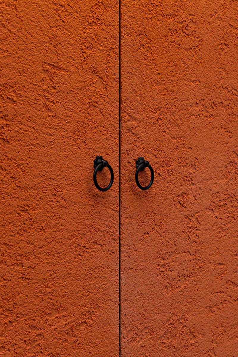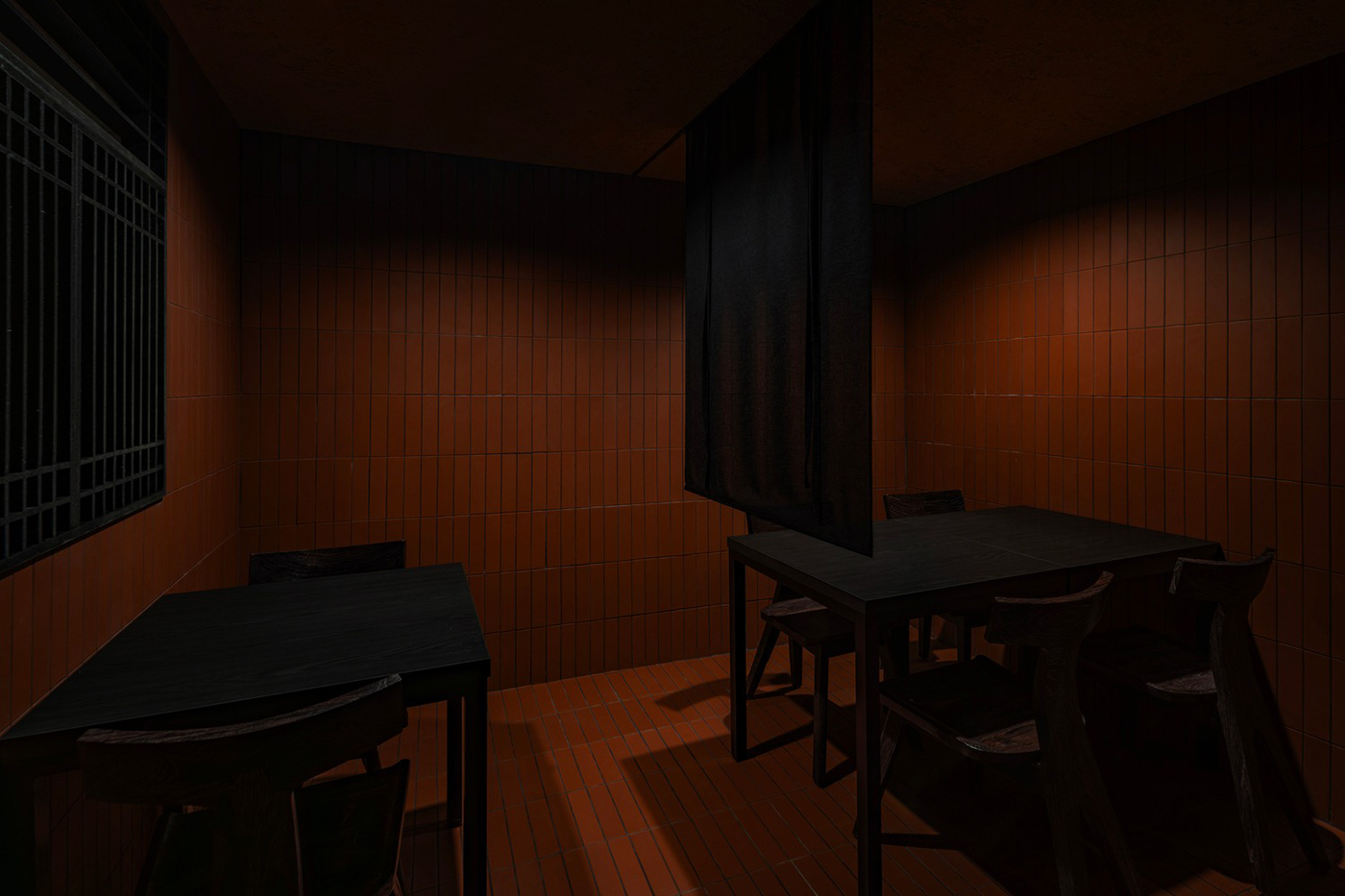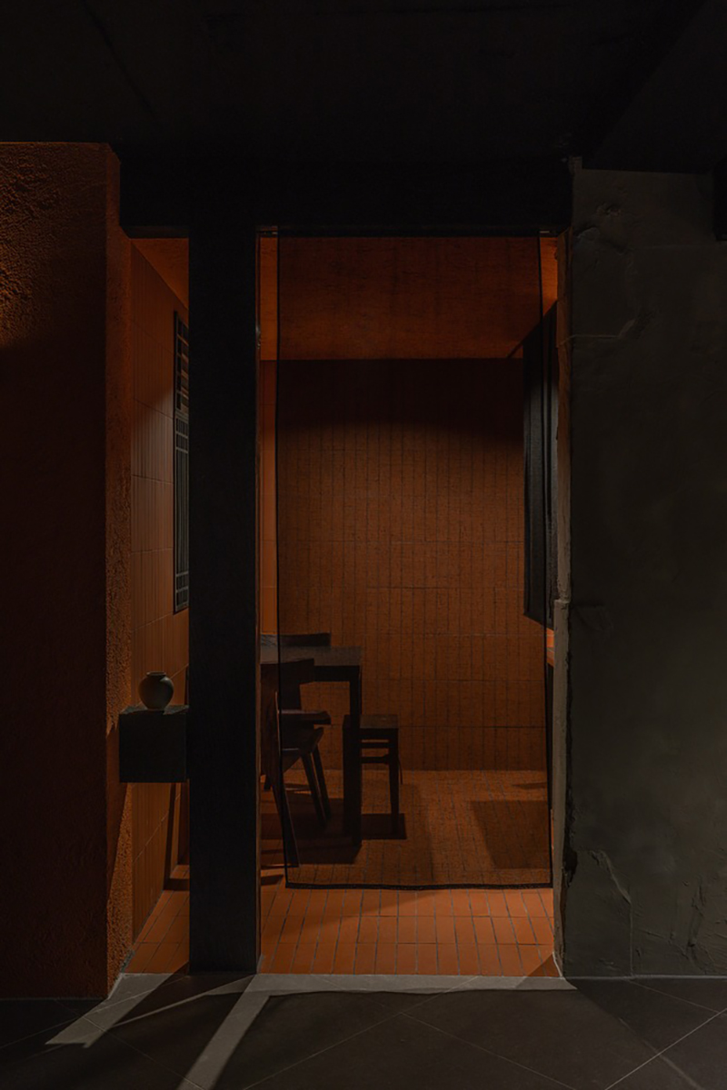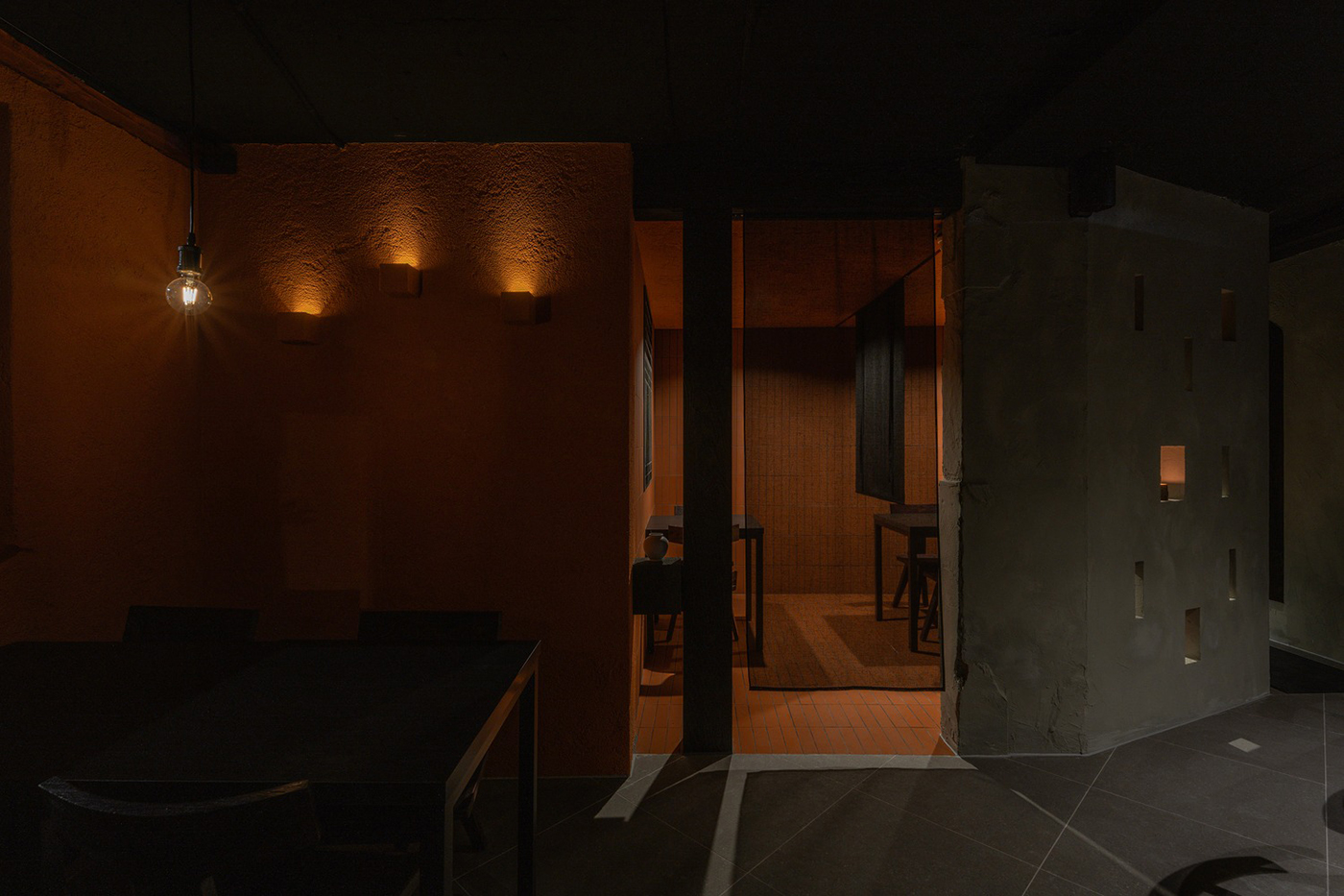 推開厚實的大門,首先迎接酒客的便是以黑色為基調的吧檯座位區。高腳椅、深色塗裝與俐落線條,構築出一種現代而幹練的氛圍,適合獨自小酌或短暫停留。隨著腳步深入內部的包廂區域,空間氛圍則轉為溫潤而安定。赤陶色在此被更大面積地運用,牆面材質也從略顯粗糙的混凝土,轉換成帶有紋理的磚紋磁磚,視覺上更為溫暖,人們在此也能自然地放鬆。