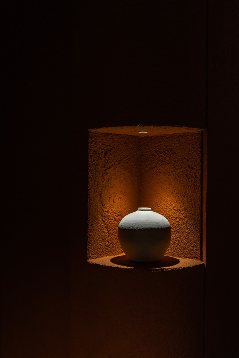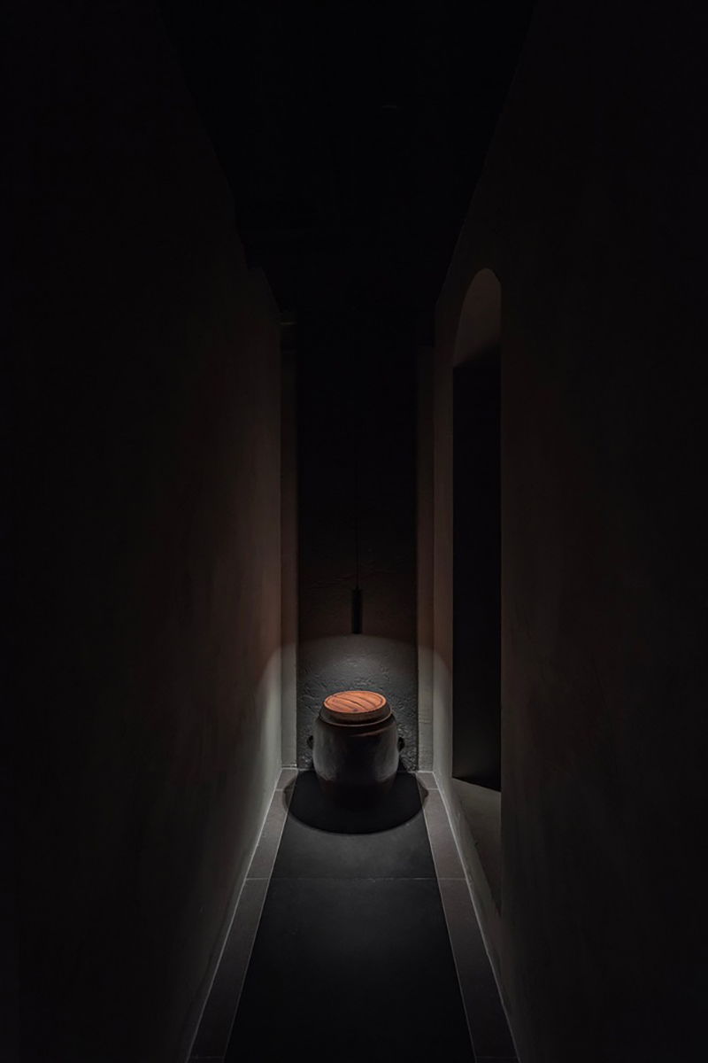 空間設計由首爾設計工作室 DEEF 操刀,他們擅長以抽象且富層次的敘事手法構築空間,重視人們進入之前、停留之中,以及離開之後所留下的記憶與餘韻。設計團隊以現代語彙,為 Horongbul 勾勒出與傳統文化和諧共處的簡約場景。從外部延伸至室內的黑色塗裝與瓷磚,形塑出夜晚般的深邃氛圍,並以品牌的主色調「赤陶色」相映成趣。這種源自燒製泥土、擁抱火焰而生的顏色,粗獷卻不失柔和,令人聯想到韓國傳統釀酒時常使用的陶甕,帶出與其文化相呼應的空間質感。