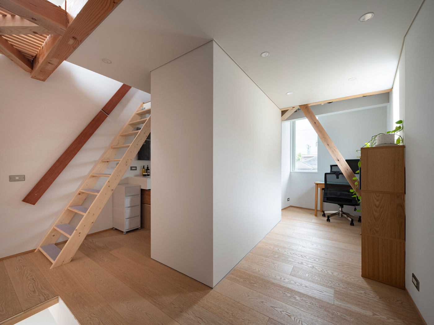 室內各層以立體連續的凹處空間串聯,不同高度與方向的開口,使光線在白牆間反射流動,展演出四季的更迭,讓居住者在日常中感受到時間推移,並於其中探索不同可能的生活方式。綠之屋就像一張立體展開的 RPG 地圖般,在城市一隅,以鮮明姿態介入街區,展開層層遞進的日常風景。