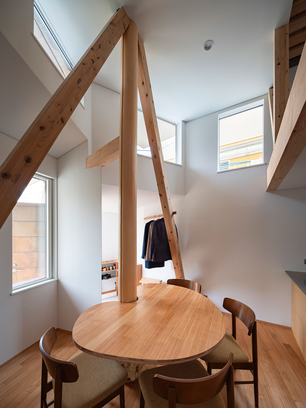 綠之屋包含了地下室、兩層樓與頂樓露天平台,室內被構想為垂直發展的單一開放式空間。進入一樓,客廳與廚房圍繞著一根原木結構柱展開,木柱同時成為空間核心與家具支點。挑高設計結合北側高側窗,將柔和天光引入室內,使狹小基地仍保有明亮開闊的感受。