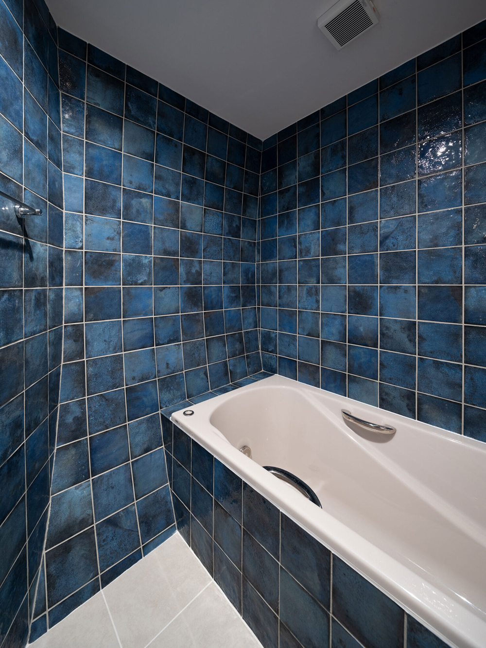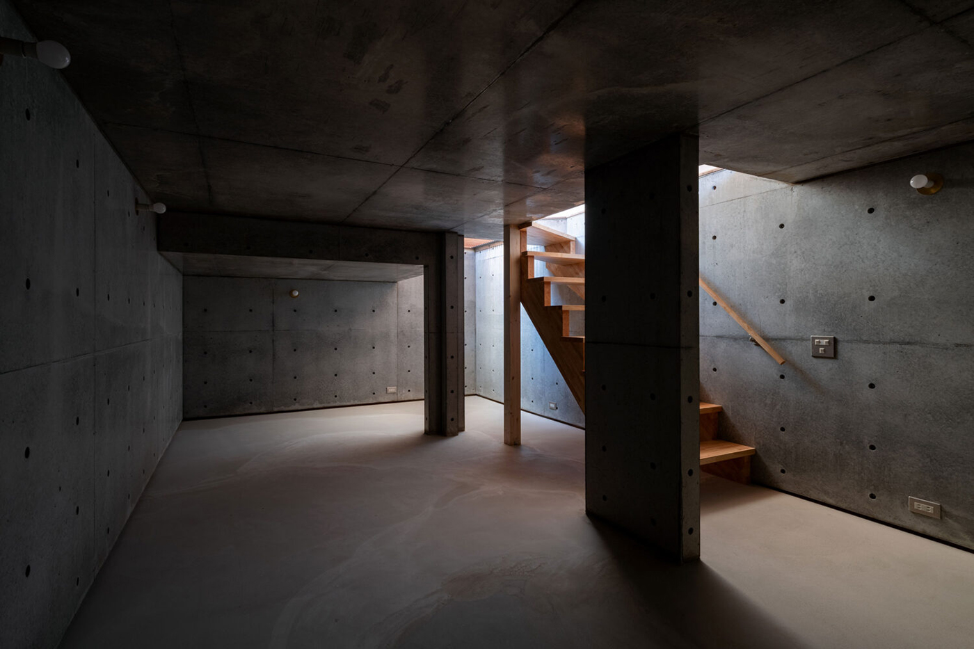 拾級而上至二樓,浴室、廁所與私人工作區配置其中,有趣的是,廁所被設於二樓的核心位置,周圍形成環狀的迴游動線,而非死板分隔的房間配置。建築師刻意不以強烈機能定義空間,讓使用方式隨生活變化而調整。半地下層則作為延伸生活場域,搭配南側塔狀的挑空空間與格柵地板,將自然光引入建築的各個角落。