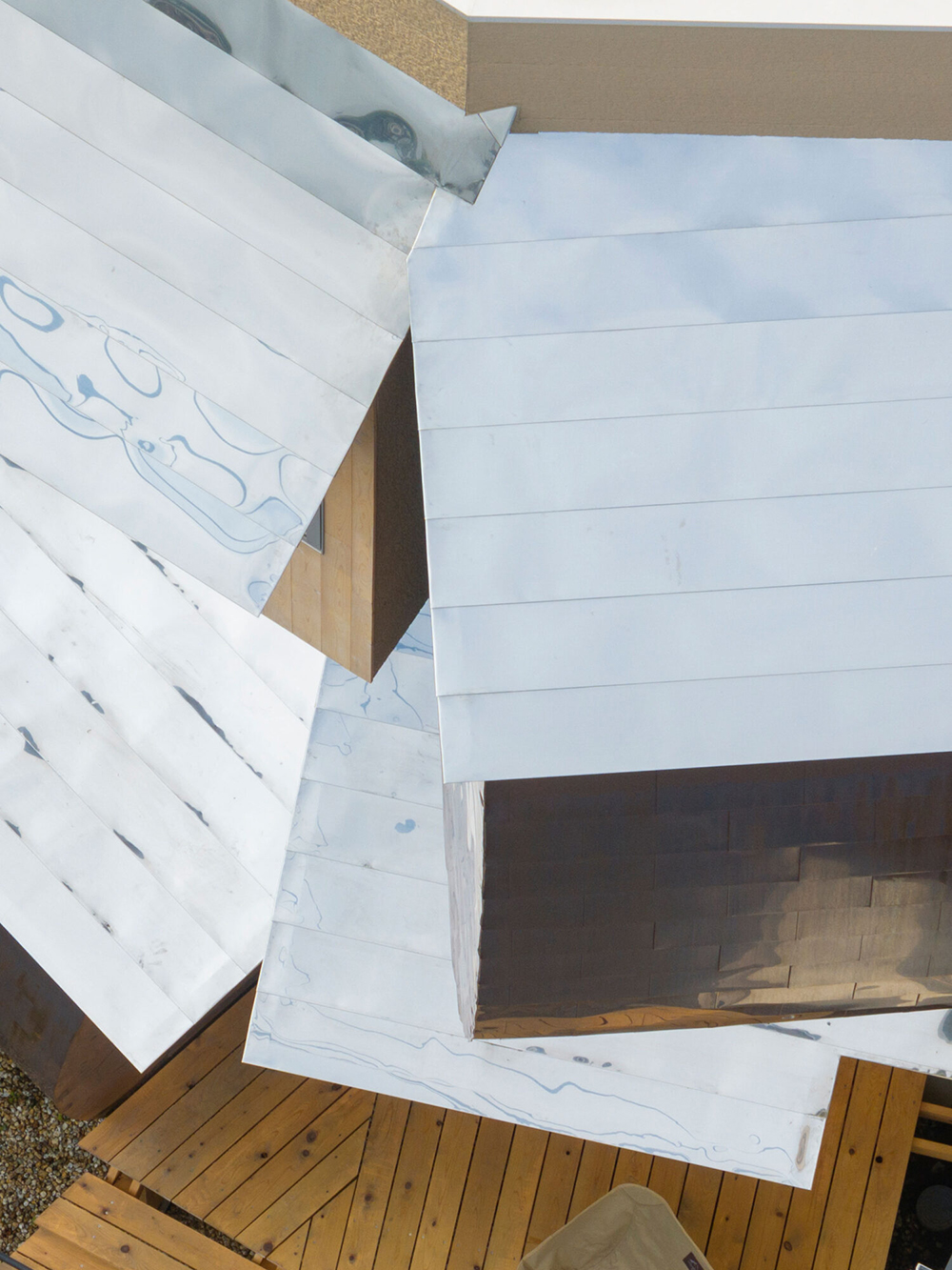 立面設計延續場景插入的概念,以曲面與平面交錯的構成,呼應綠園道樹木的自然形態。材料選用會隨時間轉化的銅板與檜木,使建築外觀彷彿具有生命,與環境一同老去。銅板採用了日式傳統屋頂瓦片鋪設工法「一文字葺」,以水平連續的細密線條鋪陳立面;檜木壁板則以直向拼接,透過縱向的線性節奏呼應周邊林蔭。立面凸出部分的屋簷統一以不鏽鋼處理,使不同材質之間既不過度統一,也不顯雜亂,形塑出一種開放而富有想像力的的城市表情。