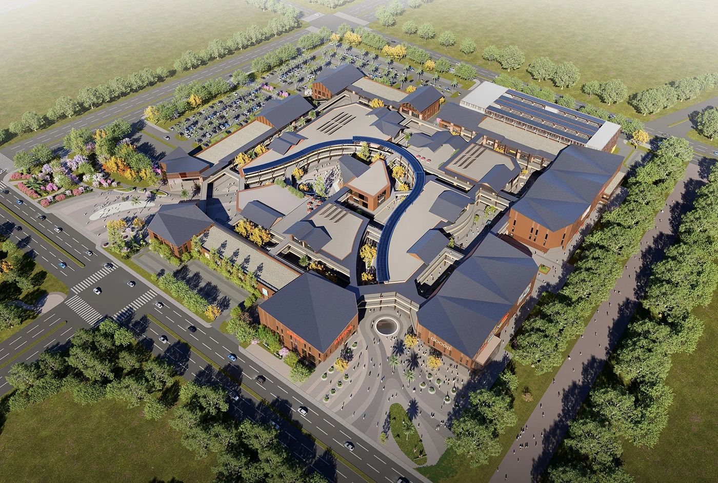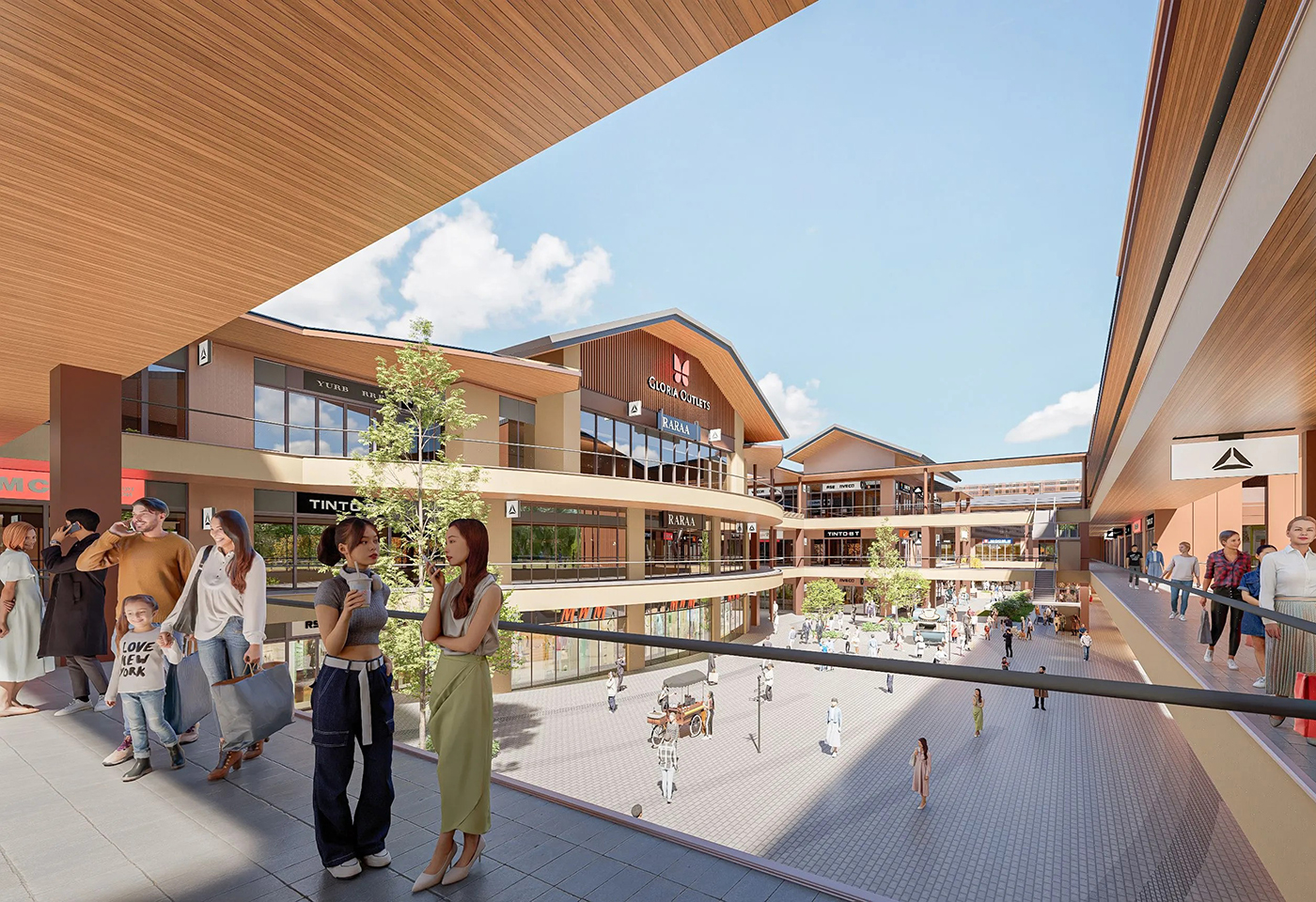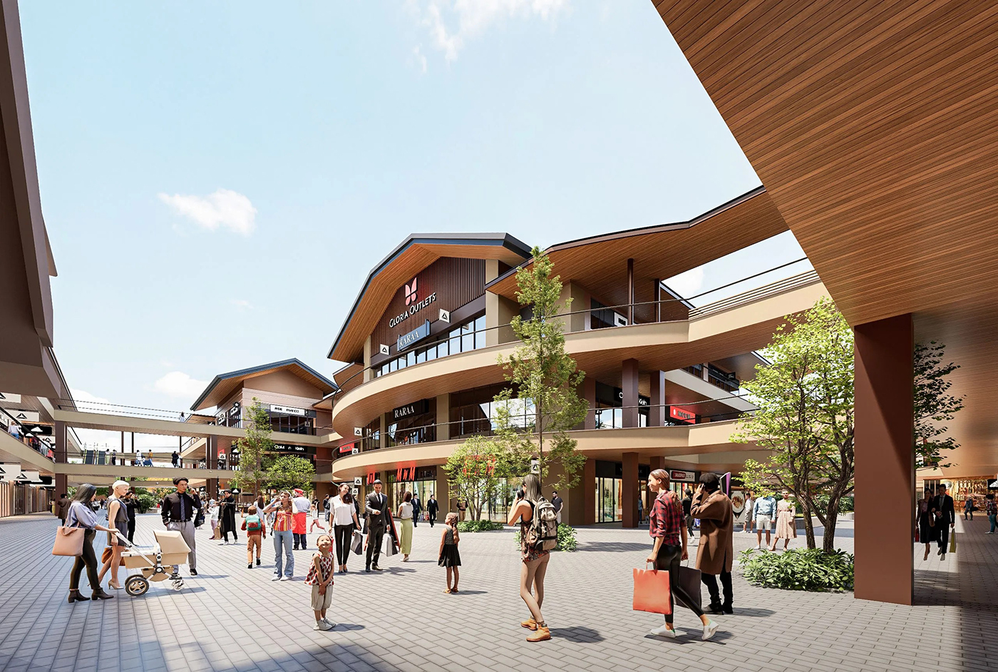 操刀嘉義華泰名品城的 JJP Architects & Planners 潘冀聯合建築師事務所,正是從這段林業發展的脈絡出發,提出回應「木都」在地紋理的購物中心構想。十多年前,JJP 以露天美式購物中心為概念,打造桃園華泰名品城;此次再度為品牌操刀,於嘉義展開第二個據點。設計團隊延續開放式空間與騎樓串接的特色,並轉化日治時期嘉義市街道系統中的主幹道「大通」──也就是今日從嘉義車站一路延伸至中央噴水圓環的中山路──作為空間發想的線索。整體園區的空間規劃以經典 Outlet 常見的雙環動線為基礎,再拉出一條明確的主要步行軸線,串聯三座廣場,讓逛街路徑不只是繞行,更像沿著城市脈絡展開的一段行走體驗。