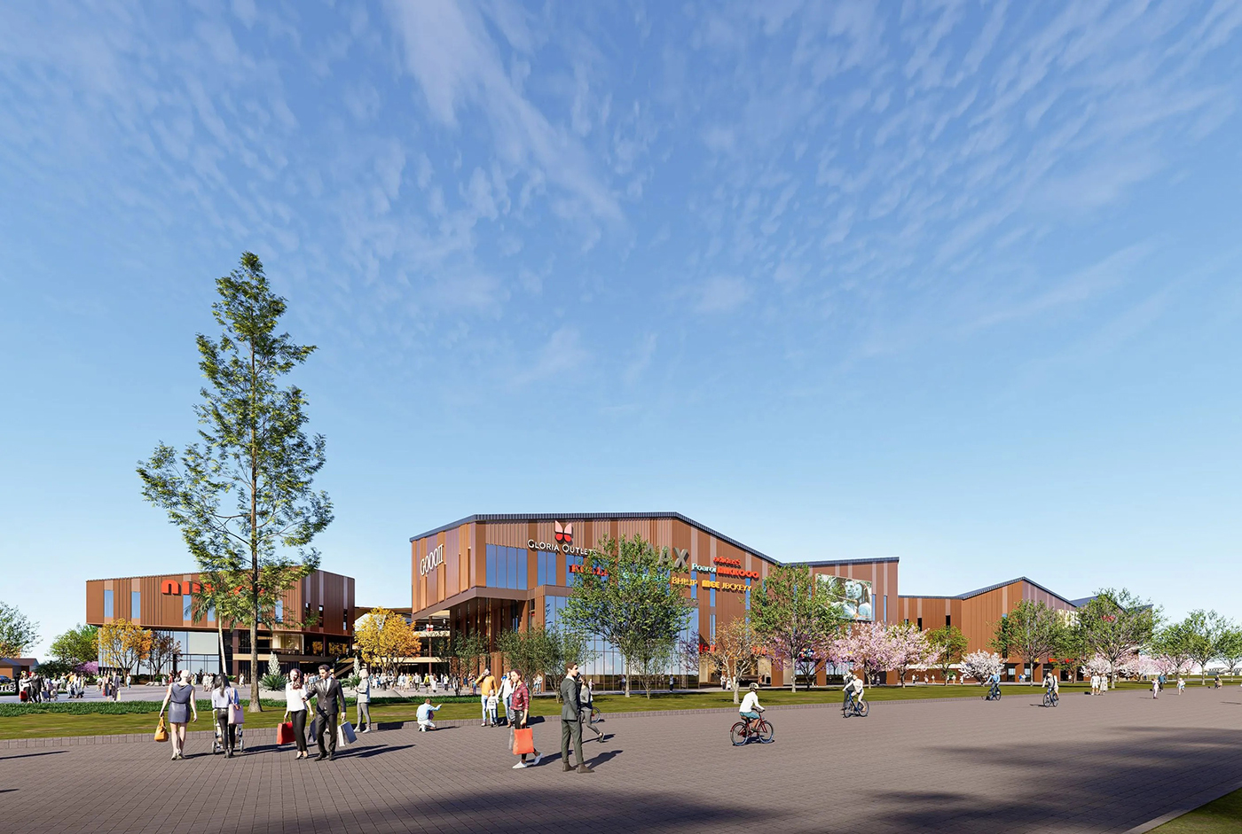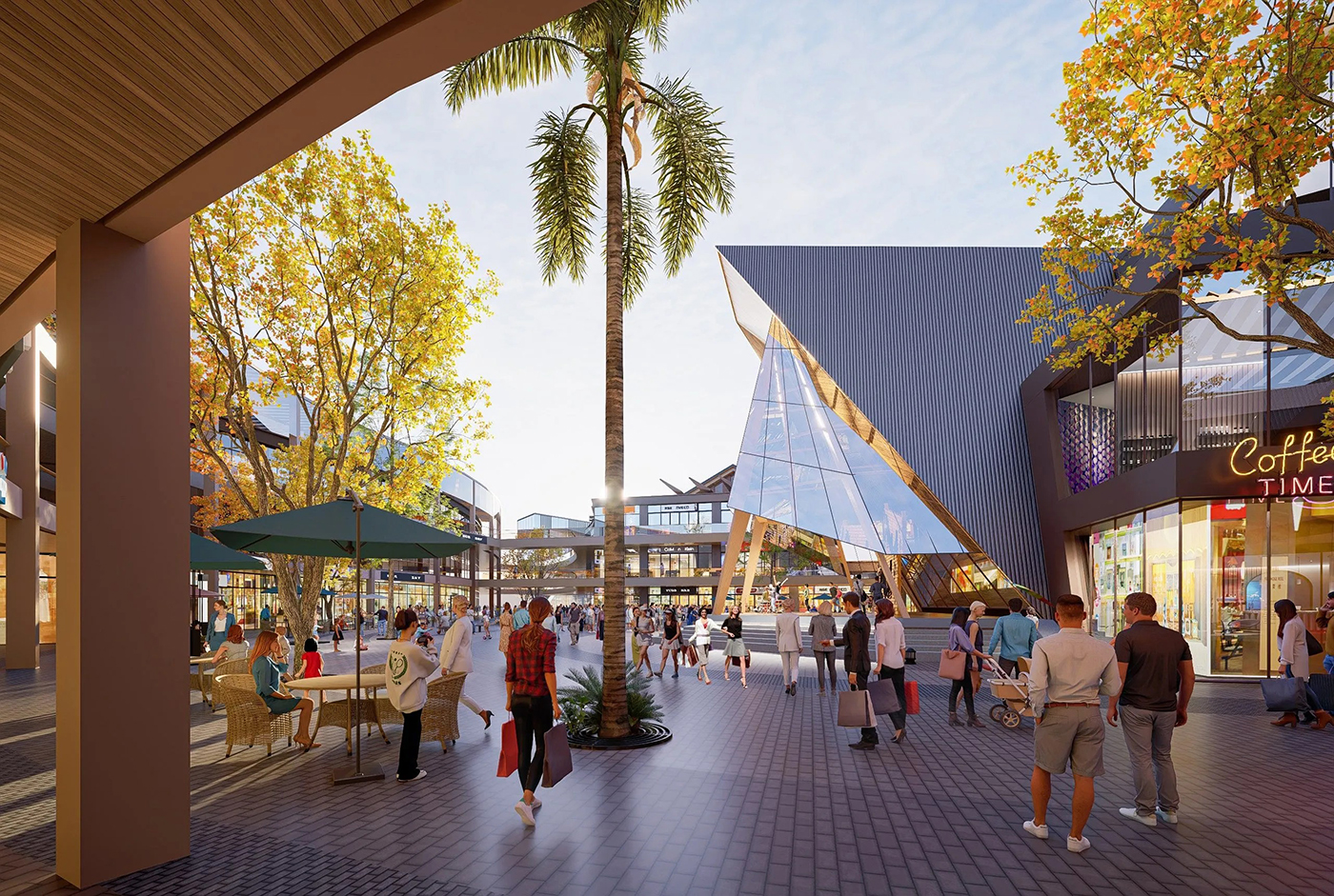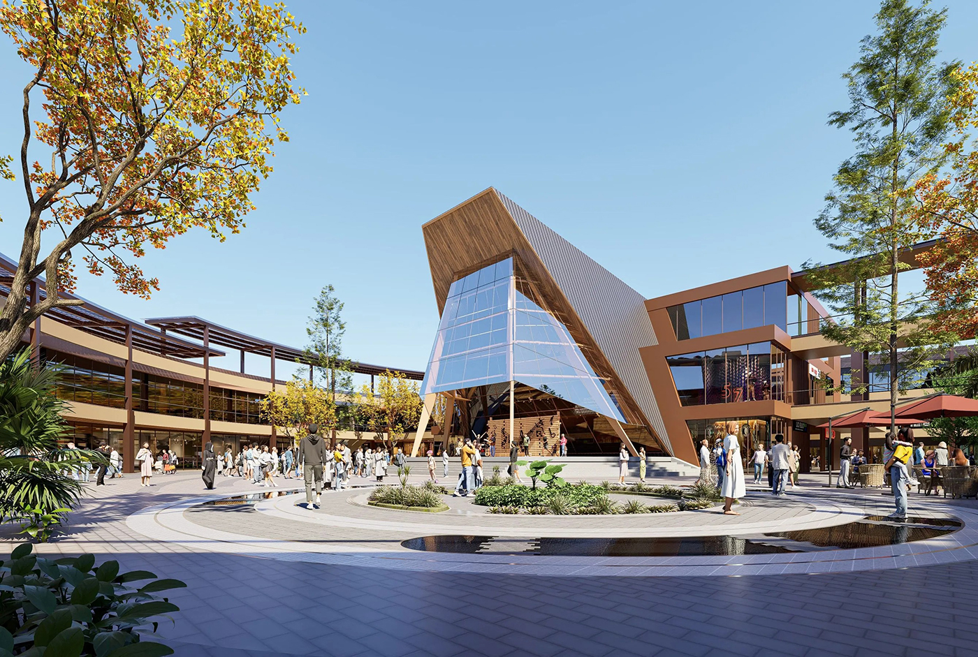 操刀嘉義華泰名品城的 JJP Architects & Planners 潘冀聯合建築師事務所,正是從這段林業發展的脈絡出發,提出回應「木都」在地紋理的購物中心構想。十多年前,JJP 以露天美式購物中心為概念,打造桃園華泰名品城;此次再度為品牌操刀,於嘉義展開第二個據點。設計團隊延續開放式空間與騎樓串接的特色,並轉化日治時期嘉義市街道系統中的主幹道「大通」──也就是今日從嘉義車站一路延伸至中央噴水圓環的中山路──作為空間發想的線索。整體園區的空間規劃以經典 Outlet 常見的雙環動線為基礎,再拉出一條明確的主要步行軸線,串聯三座廣場,讓逛街路徑不只是繞行,更像沿著城市脈絡展開的一段行走體驗。