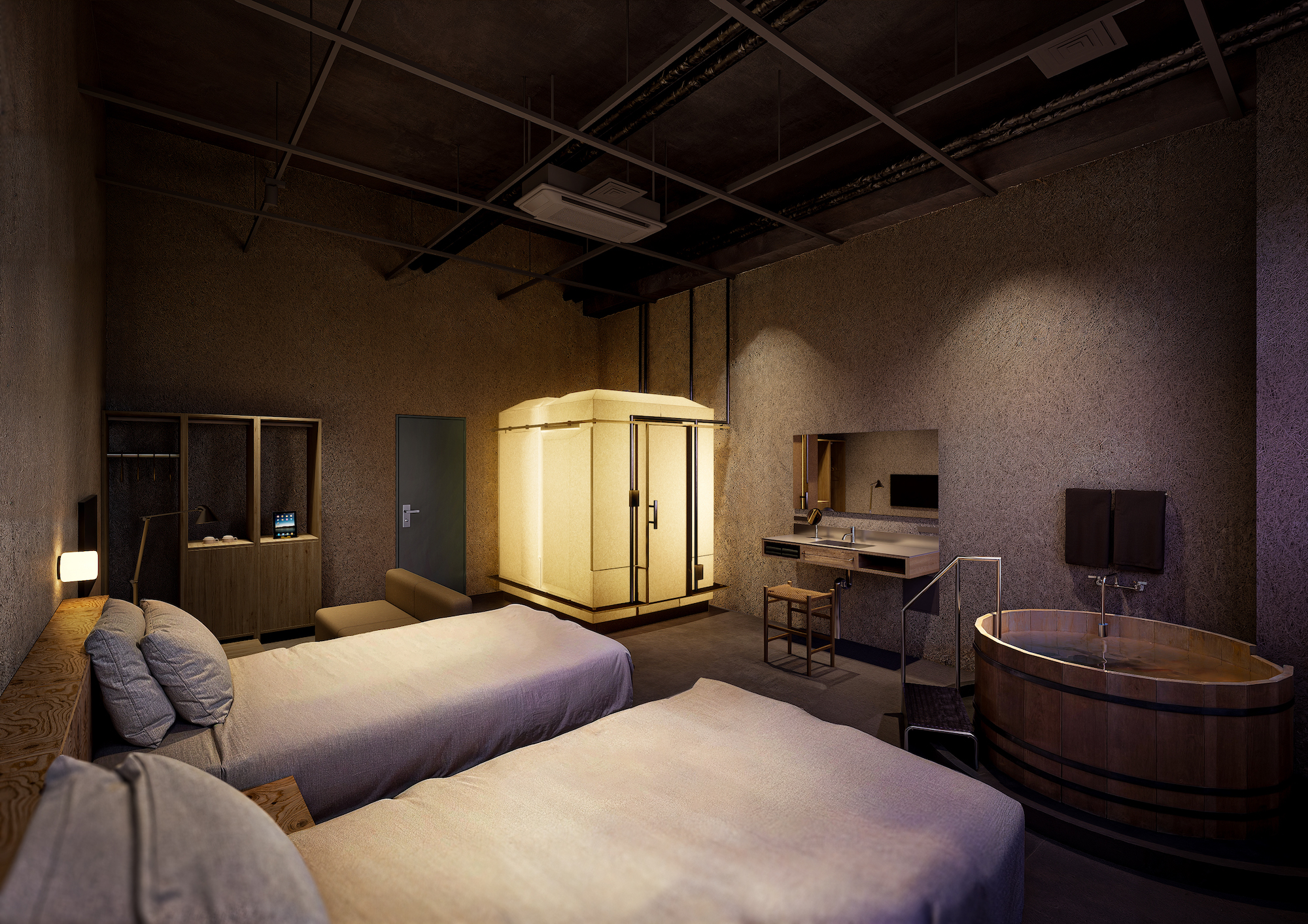 溫泉「島湯」使用的是小豆島最早湧出的溫泉之一「塩の湯」,泉質富含鈉與鎂,長年深受當地人喜愛。空間內規劃了羅浮蒸氣桑拿與冷水池,定位是一處島民與來訪者都能自在使用的公共社交場,而不只是屬於旅宿的附屬設施。