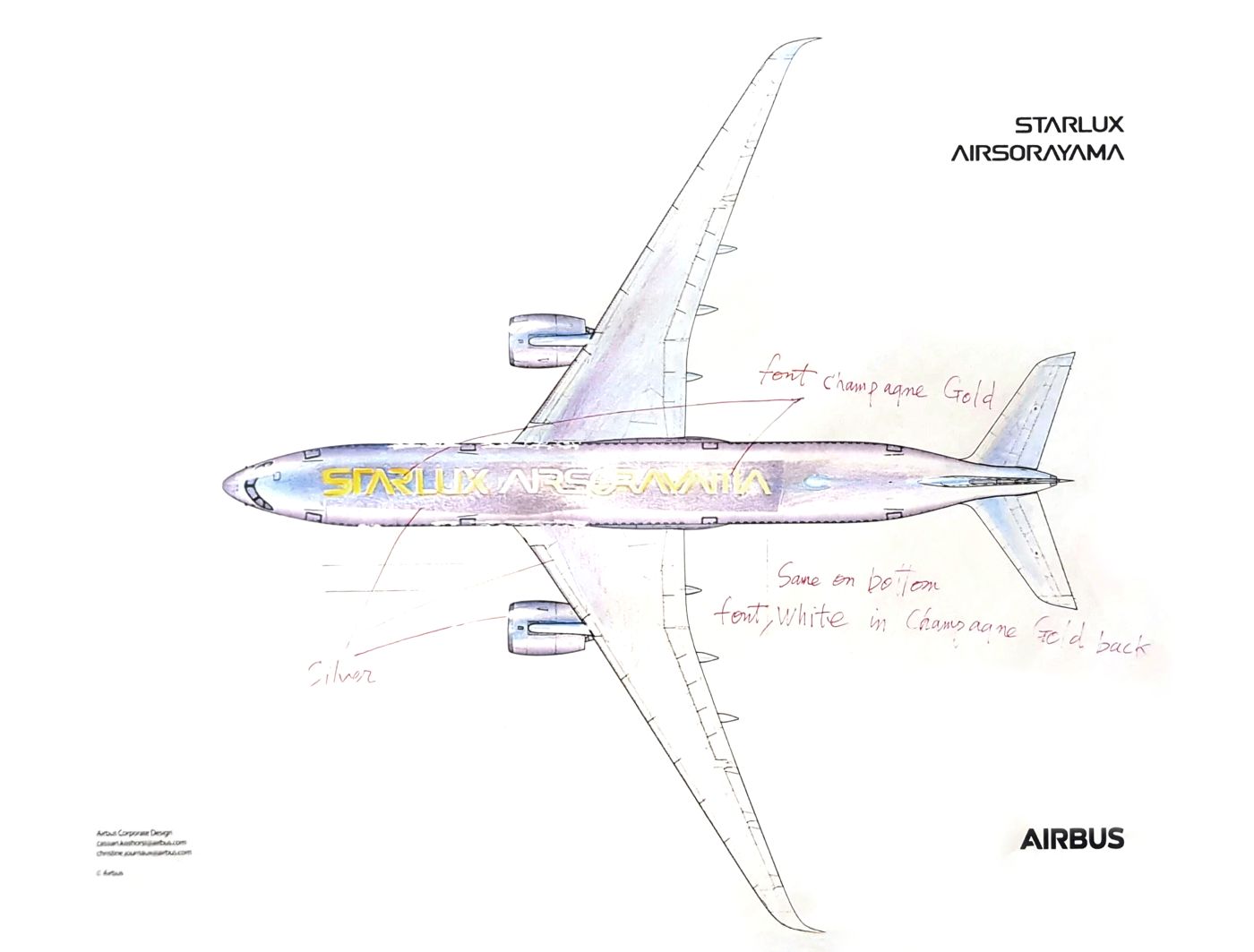 兩架A350-1000機身採用空山基標誌性的金屬銀與金屬金光澤,「STARLUX AIRSORAYAMA Silver B-58553」與「STARLUX AIRSORAYAMA Gold B-58554」,一架以銀為主軸金為輔,一架金為主軸銀為輔,單機,是獨立成章的經典;雙機,則是並行於天際的藝術對話。搭配「AIRSORAYAMA」聯名標誌,精準呈現於機身、機腹、翼尖與機頂。