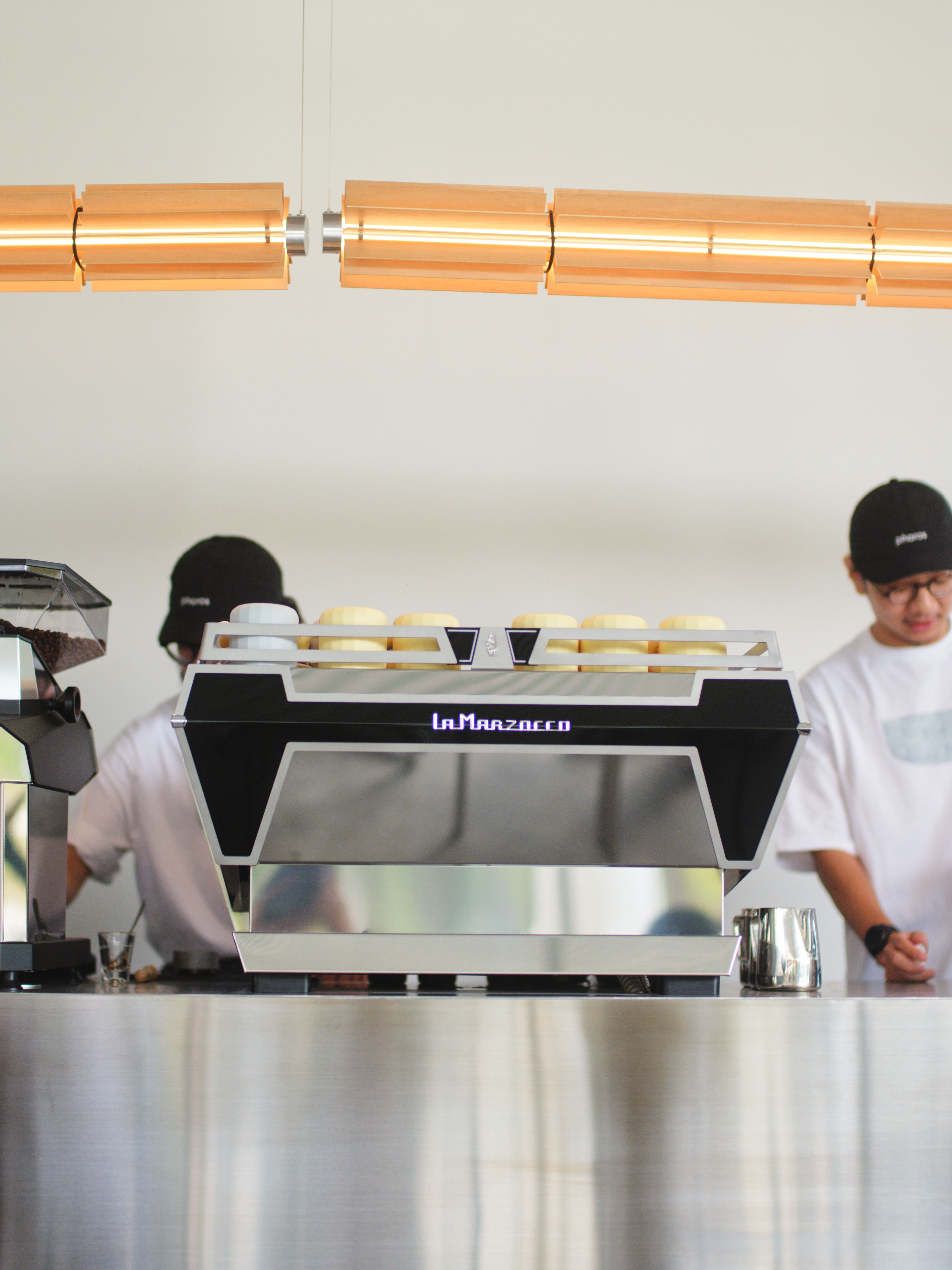 看書讓人們有了停留的理由, 一杯咖啡的時間更使人有餘裕地品味這個空間。在書店的另一角落是 Pharos Coffee,其名字取自希臘文「燈塔」,象徵在綠美圖通透的空間中,這裡像一座指引味道的燈塔。Pharos 強調咖啡融入生活,提供淺焙單品手沖、義式咖啡和手作麵包等輕食,店裡家具也是台灣設計團隊製作。