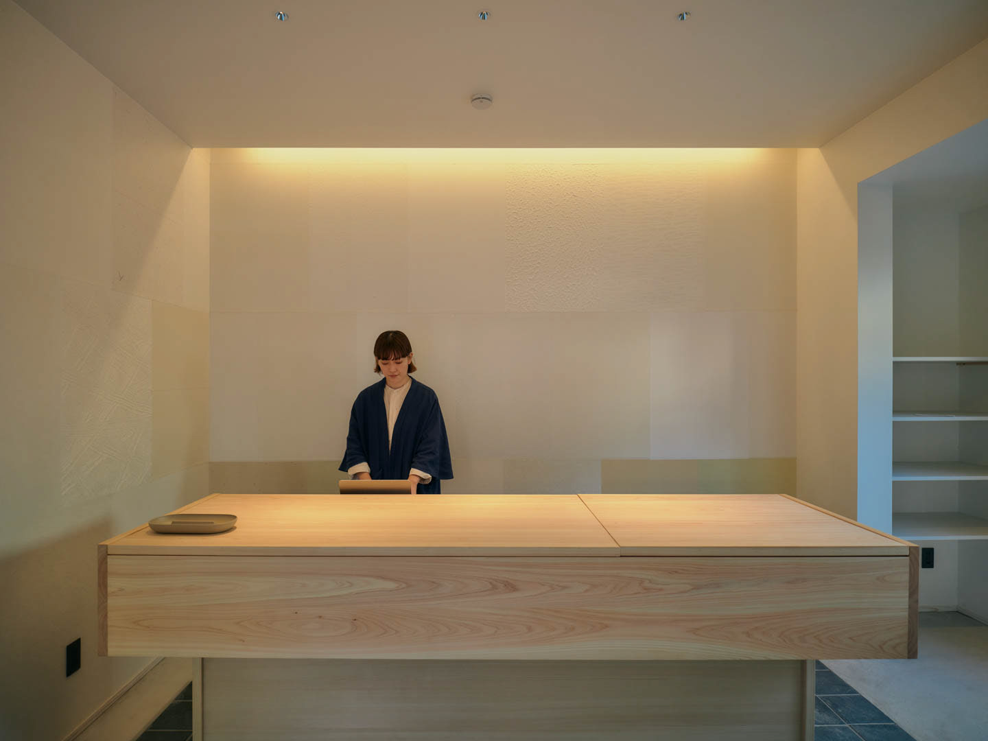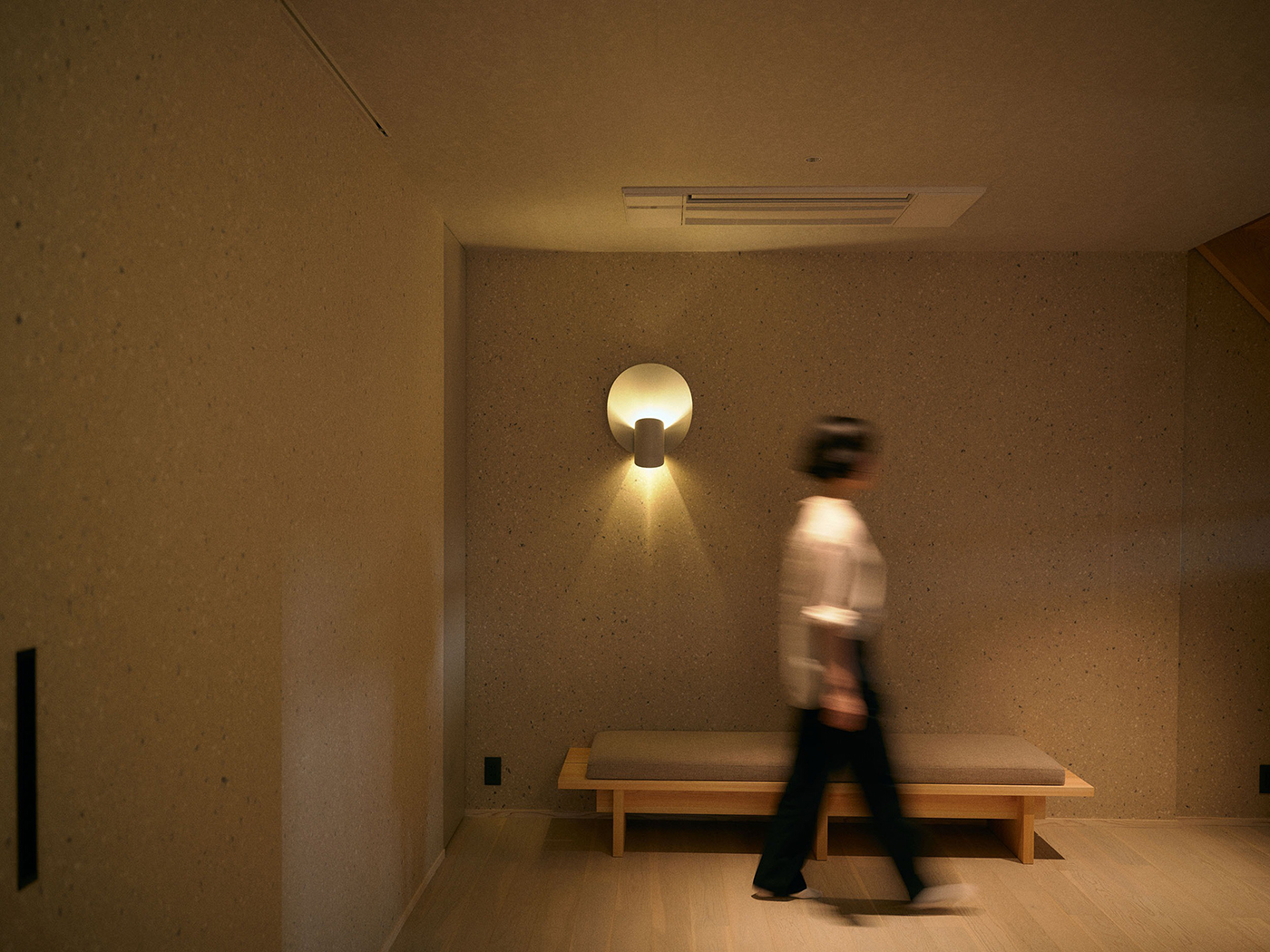 旅宿的空間設計由 Zelt 的柴山修平操刀,全館僅設三間房型,皆為兩層樓的配置。SUKU 入口處以模仿紙張「耳緣」的門簾作為過渡,掀開後迎來的是接待空間,牆面由 16 間和紙店家的白色和紙層層拼貼而成,呈現出產地多元而共存的樣貌。