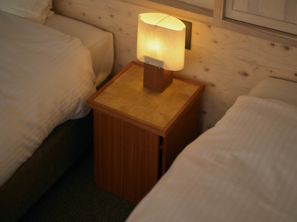 在「SUKU」中,越前和紙成為被重新詮釋的存在。旅宿除了大量採用 16 位和紙職人的作品,也與在地年輕創意團隊「閃(SEN)」合作,為空間量身打造燈具與家具。其中,上田樹一的「Transflect」系列,將極薄的和紙貼合於鋁板之上,使和紙柔和的透光性與鋁材的強度並存;高田陸央的「Tansu remake」,則以旅宿內原有的老箪笥為基礎,重新貼覆越前和紙並施以柿澀,讓傳統耐久技法在時間推移中展現新的表情。