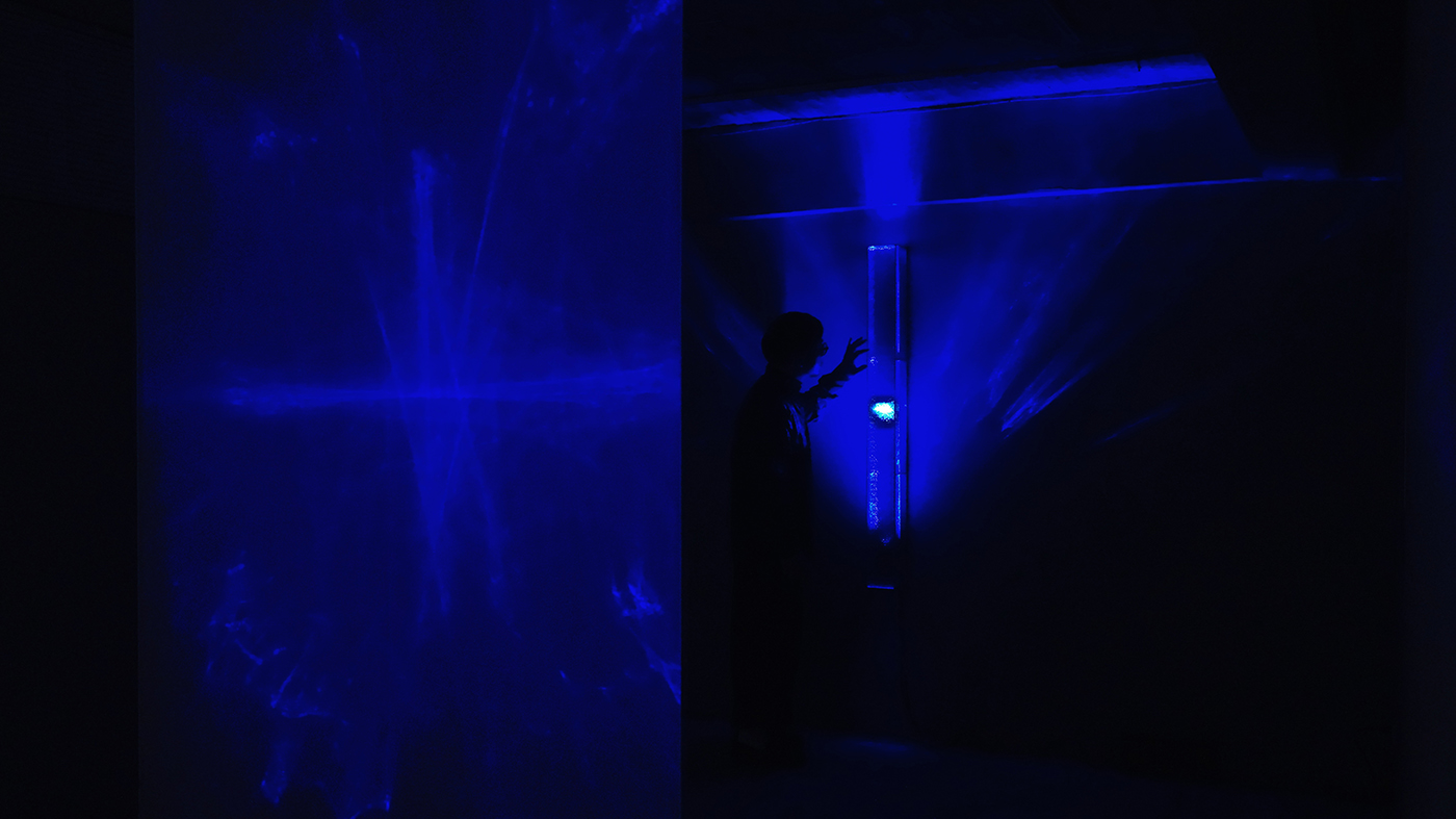 當感知逐步沉入更深層的靜默,動線最終抵達深處的空間裝置《彼端》。雷射光穿透海棠花玻璃後折射出不斷變化的藍色光紋,熟悉的工藝材料在此生成陌生而抽象的風景,延展出的是難以言說的感受本身。