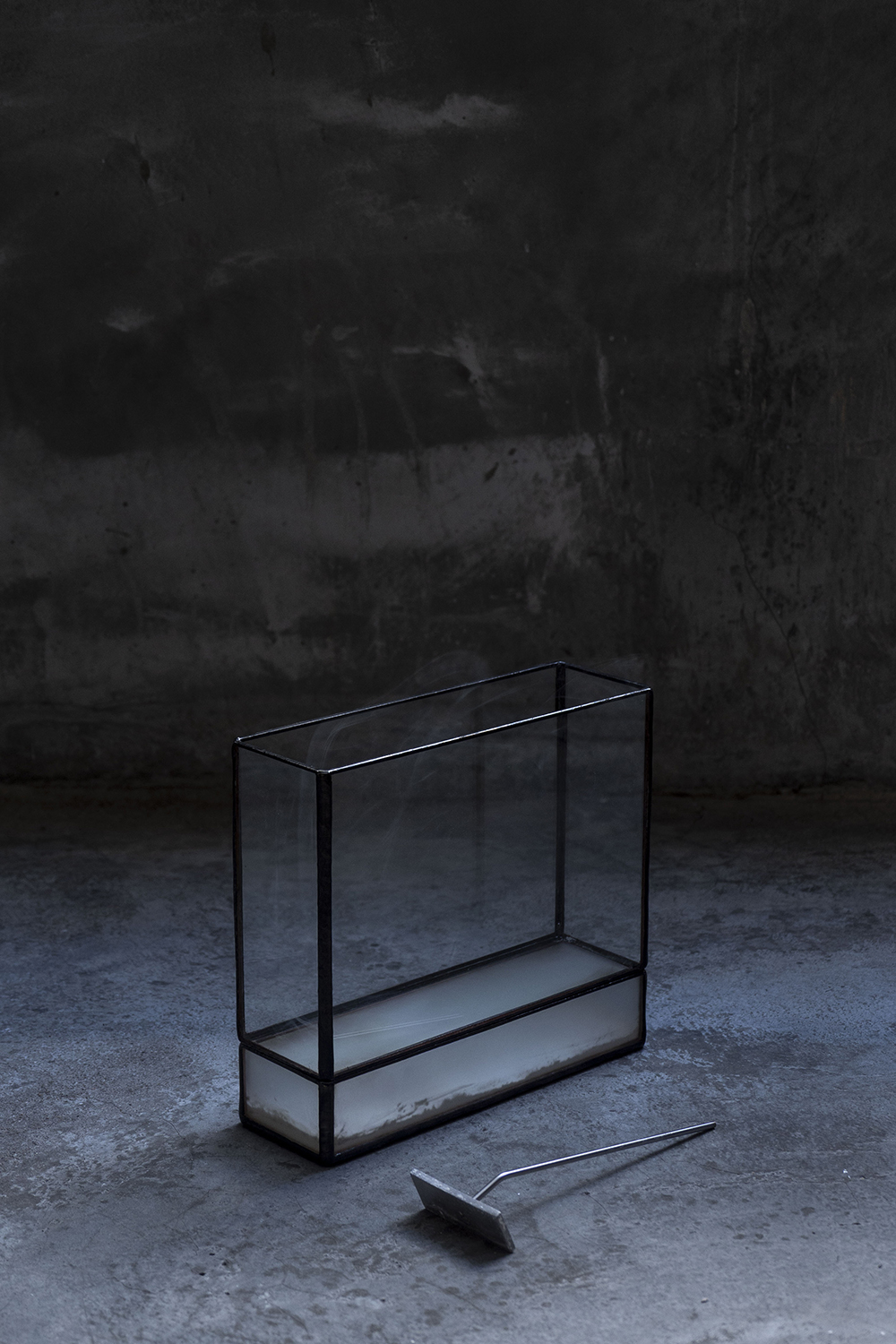 在其最新個展《內光》中,光不再只是穿透玻璃的物理現象,而是一種與身體共同生成的感知媒介。展場入口的作品《入林》,以十組可被觸發的空間裝置圍繞觀者,使鳥鳴、雨聲、水流與風聲等自然聲響在觸碰之間層層展開,身體彷彿步入未知森林,瀰漫其中的緊張、遲疑與微妙的恐懼感,也同時開啟觀者的想像。隨後呈現的另一件香台作品《霧境》,像是香與煙霧的觀景窗,線香燃燒的煙霧在透明玻璃中緩慢翻湧,氣味也悄然擴散,視線、呼吸與時間一同沉入當下。透過聽覺與嗅覺的引導,展場被轉化為一條由外而內的感官動線,觀者也在行走之中逐步貼近自身更細微的感受。