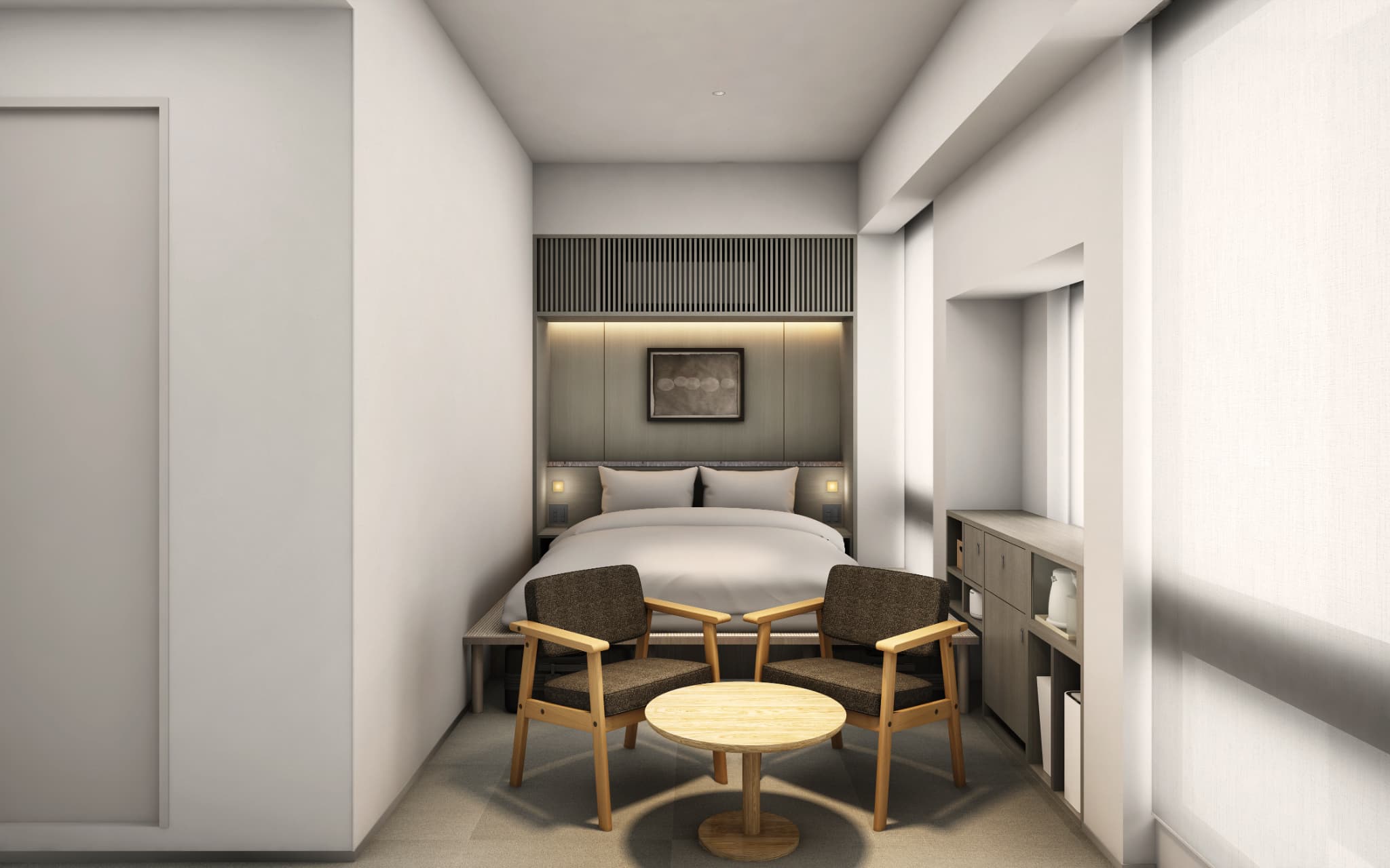 客房以無印良品家具與織品為主軸,搭配京都及近郊創作者的作品,在簡潔基調中加入細緻層次。房型涵蓋雙人房、可容納 3 人的 Twin 房型,以及最多 4 人入住的 Family Room(附浴缸),房間面積雖然不大,但設計講究尺度感,讓人住得舒適自在,強調尺度與機能的平衡,而不是奢華鋪陳。整體空間語言回到「素」的感覺,在留白之中,讓材料、光線與比例說話。