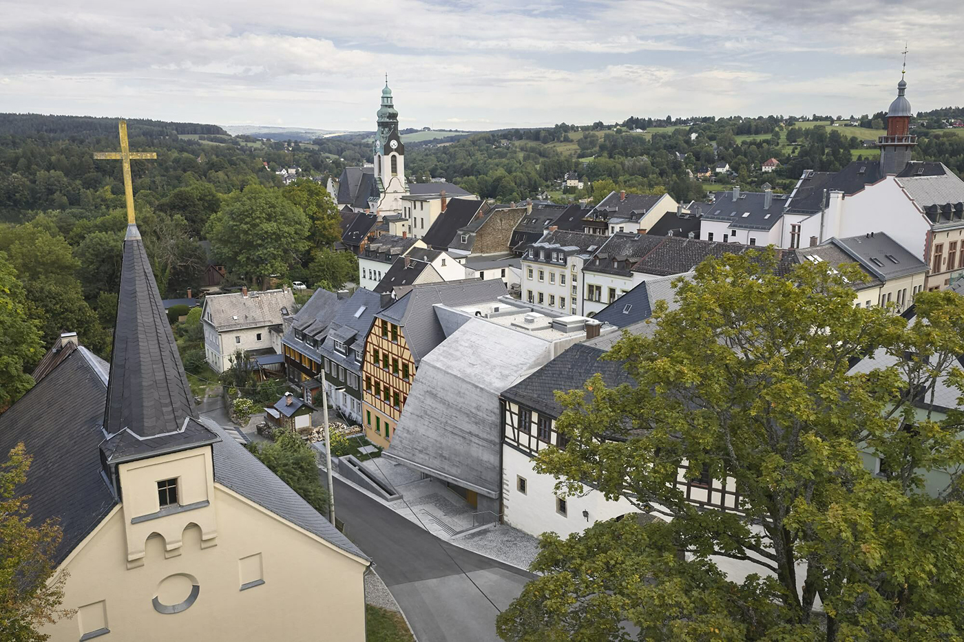 在擴建規劃中,Schulz und Schulz 一方面修復並整合周邊歷史木構建築,使其重新融入公共生活;另一方面,為新館塑造鮮明而具象徵性的形象。設計靈感來自淡水珠蚌的構造,其粗糙外殼與細緻內層形成強烈對比,卻又密不可分。