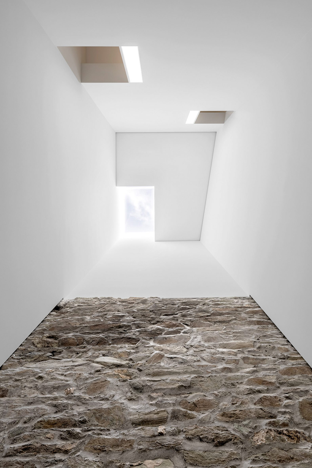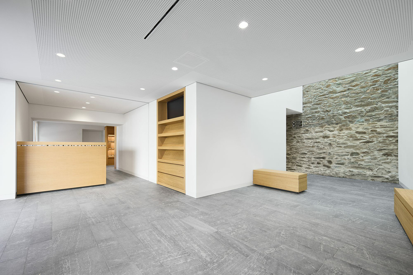 步入室內,氛圍隨即轉為明亮,牆面與天花多以平滑白色處理,呼應蚌殼內層那道柔和而閃耀的光澤。從接待大廳前行,迎面是一座高挑中庭與中世紀城牆遺構。這段厚實石牆貫穿不同樓層,透過上方與側邊開窗,引入天空與綠意,讓古老石材在自然光下展現歲月紋理,與當代空間交織出一種跨越時代的獨特氛圍。