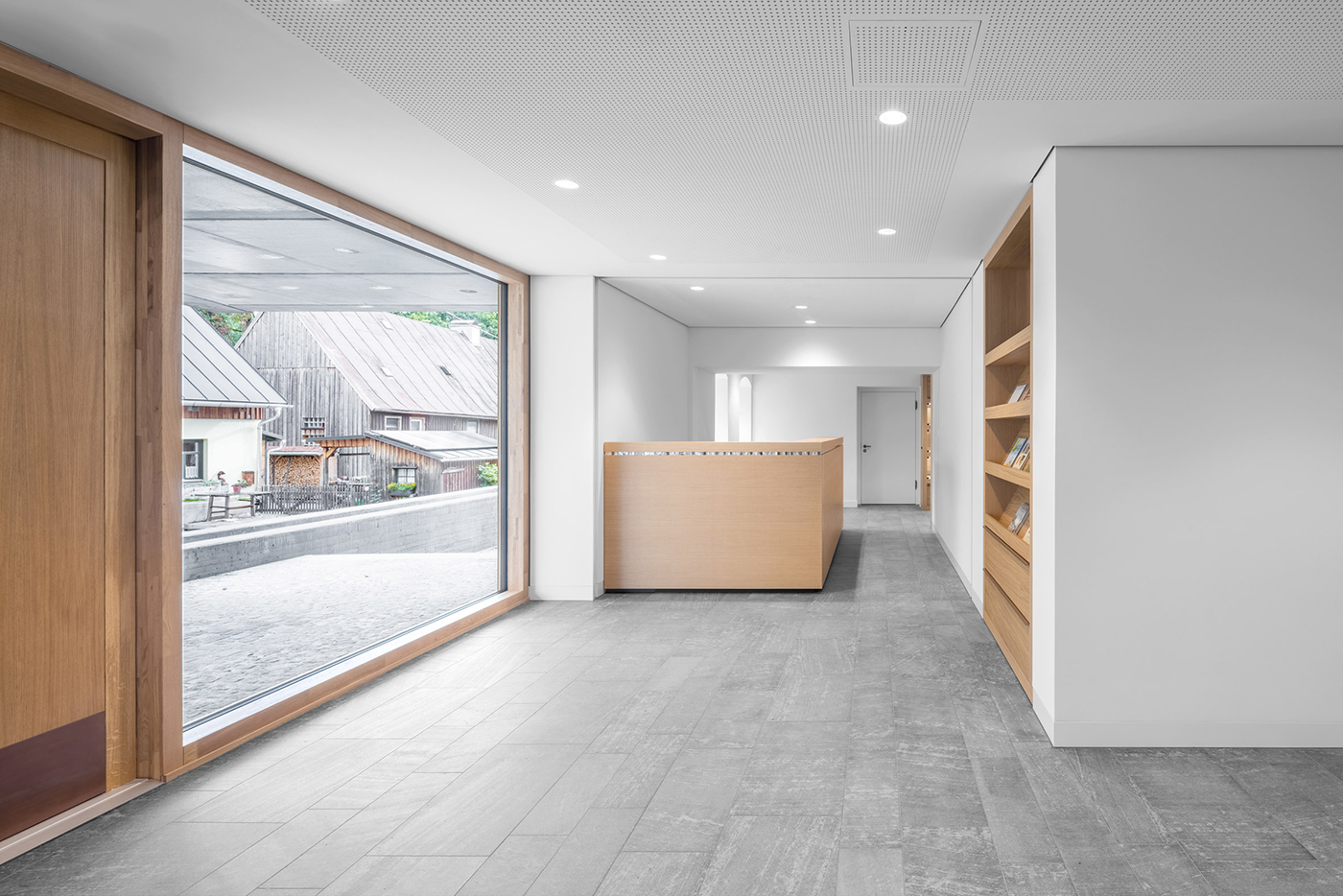 新館外觀以清水混凝土構成,保留了板模紋理的粗獷質地,不對稱、略帶扭轉的幾何量體,彷彿一枚靜靜棲息於老城中的石蚌。向街道突出的立面懸挑於入口上方,形成半遮蔽的前庭;一旁則設有池內安放巨型圓石的長方形水池裝置,雨水會沿立面導水溝流下,緩緩匯入池中。沒有張揚的水景效果,只有持續流動的水聲,象徵流水作為蚌類生命之源,也呼應小鎮與河流的歷史連結。