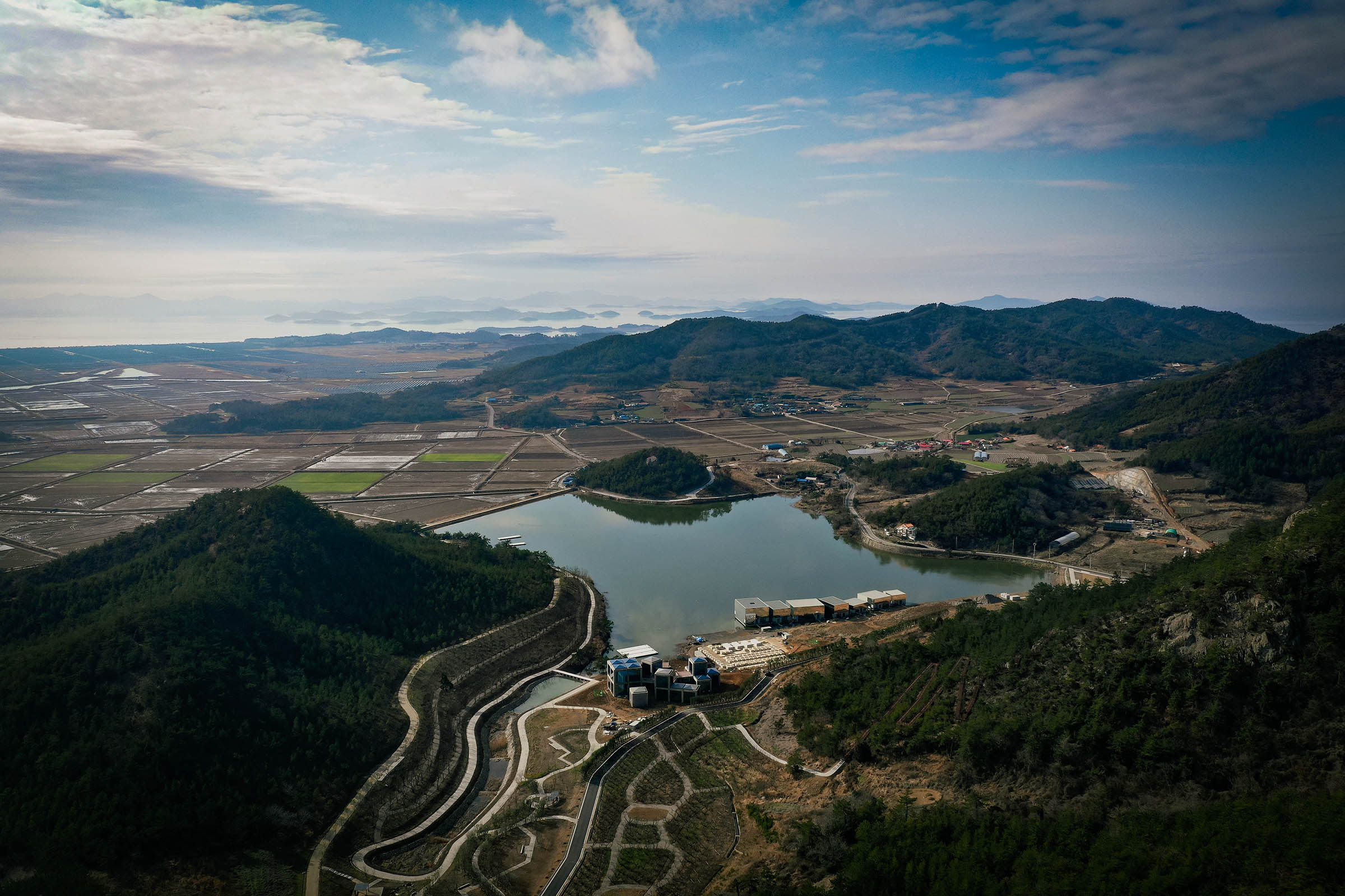 (Photo Credit:YANAGI+ARTBASE)七個大小不同的立方體像小島般散落在水面上,既呼應全羅南道西側的群島,也象徵世界七大洲。鏡面外牆捕捉天空、雲影、潮汐與泥灘的光影,建築似乎隨環境消失,又透過反射重構景致。這是柳幸典擅長使用的設計手法,讓建築與環境對話,他的作品常用光線、倒影與簡潔幾何量體,使空間呈現夢幻而流動的效果。