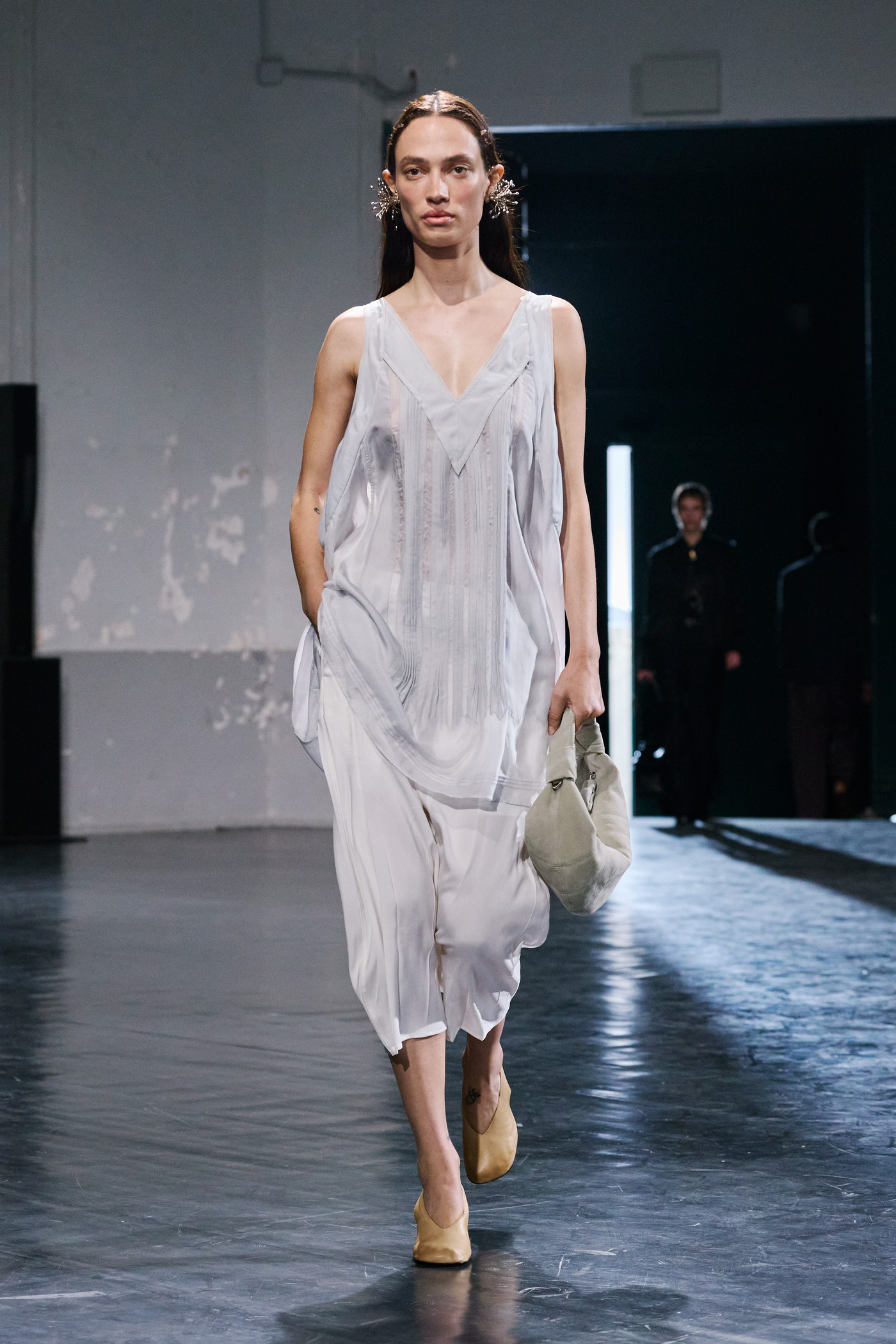 通透與朦朧取得精妙平衡,材質間的對比成為敘事核心——霧感薄紗與挺括面料交錯,光澤與霧面相映成趣。品牌標誌性的體積比例與扭縫語彙於本季重新調整,在輕盈與力量之間找到新的節奏。
