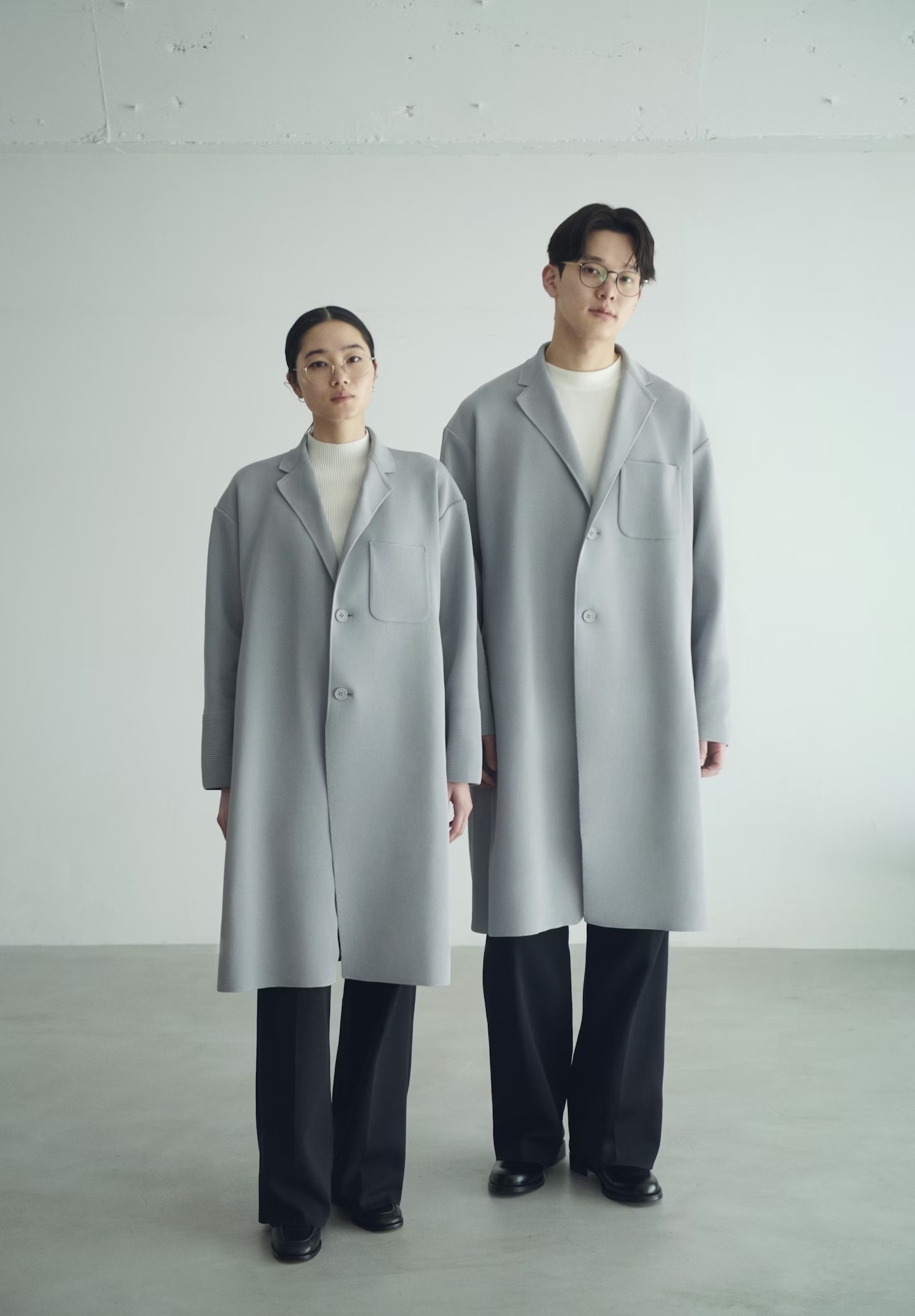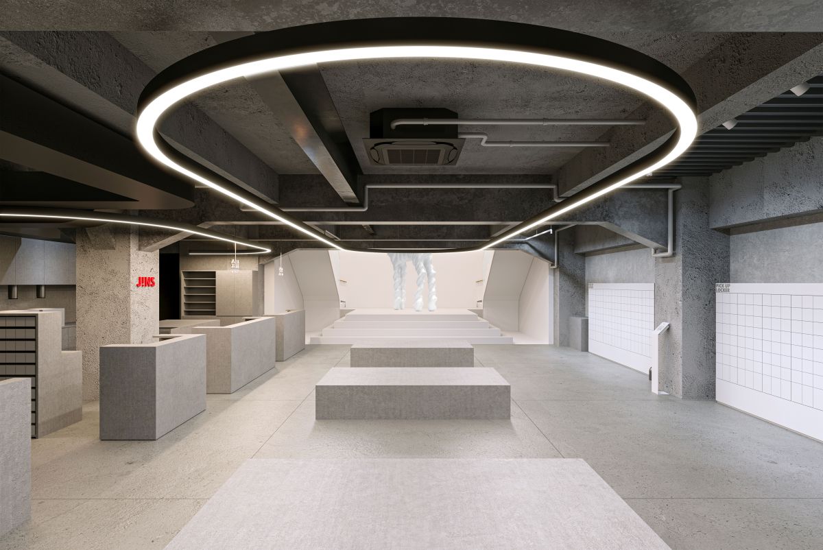 連店員制服也經過特別設計。品牌邀請日本時裝品牌 CFCL 製作專屬制服,以品牌標誌性的針織服裝為基礎,強調「作為現代生活工具的衣服」。整套制服採日本製造並具備完整溯源,冬季版本為長版外套,夏季則是短袖襯衫。整體以灰色為主調,背後則點綴著 JINS 標誌性的紅色「!」符號,在沉穩中帶一點俐落的識別感。