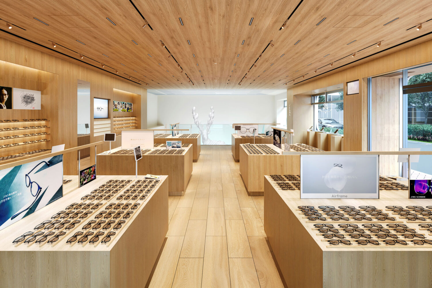 走進店內,一樓空間像是一棵被掏空的大樹內部:高挑、安靜,卻又帶著一點神聖感。眼鏡展示分布在空間之中,而中央則是一個從一樓延伸到地下的挑空結構。左右對稱的階梯向下延伸,視線自然被引導到地下層。透過如此的動線安排,讓人在移動中,於建築裡慢慢「發現」新的視角,這也是藤本壯介常使用的空間策略。