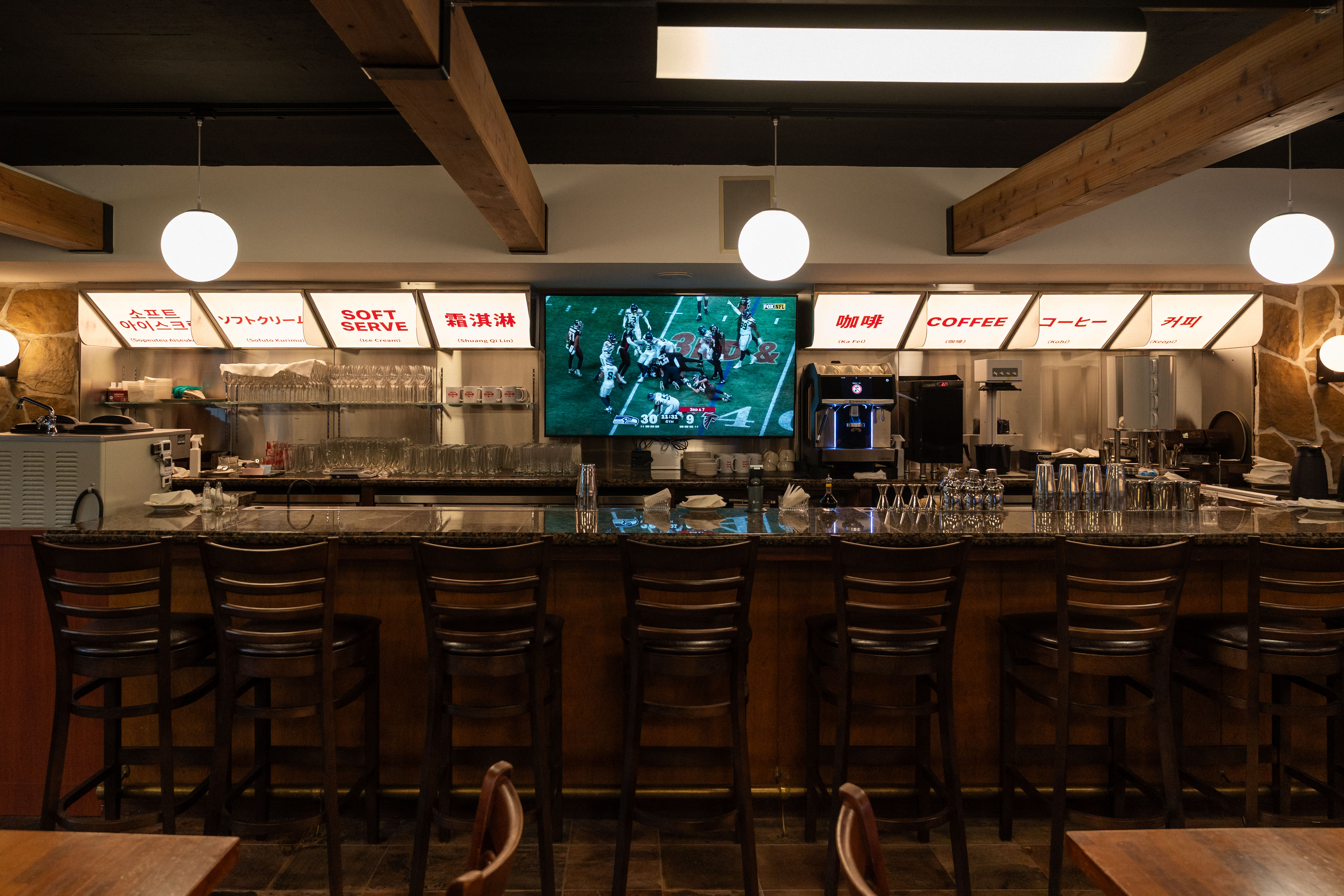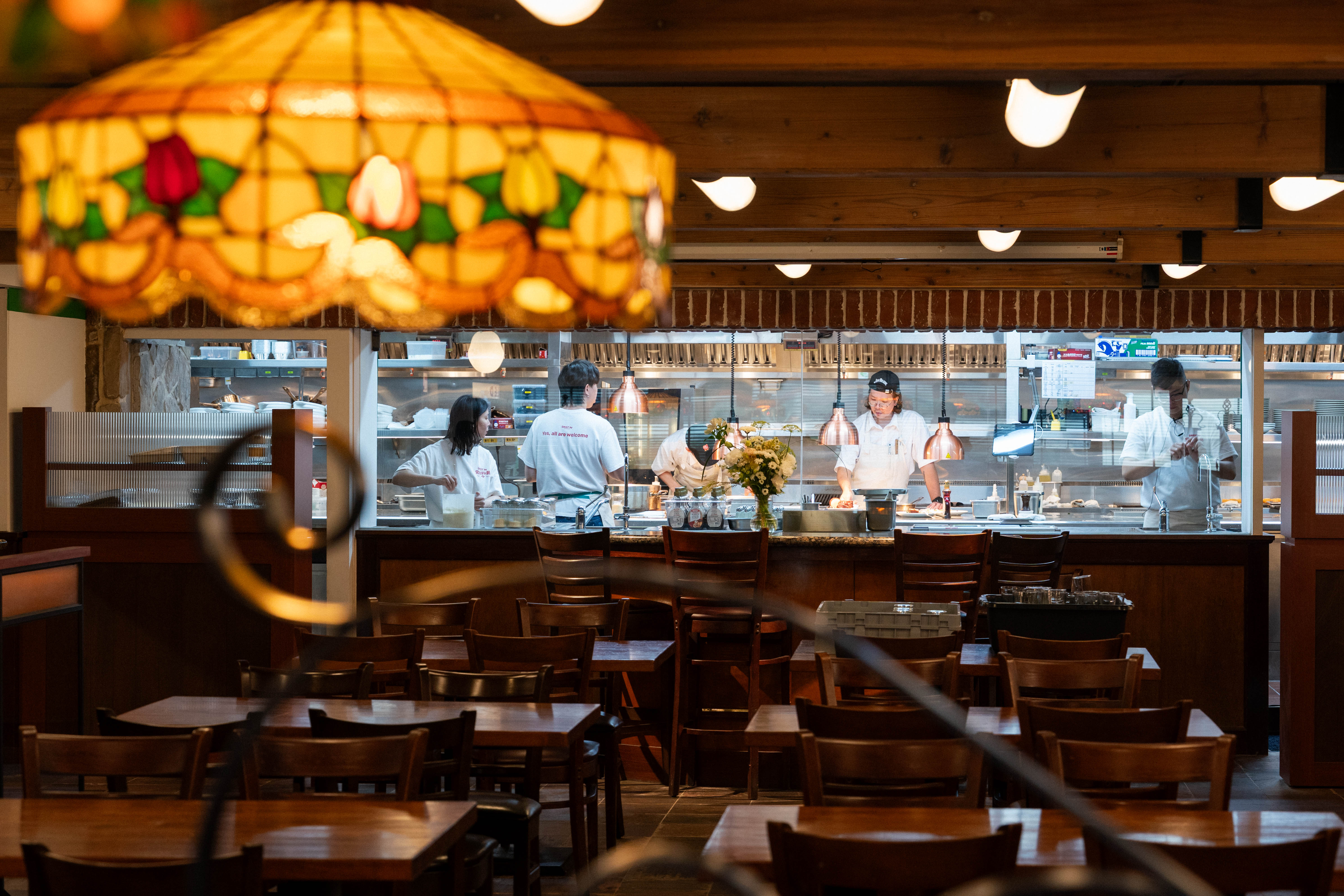 原有的木質桌椅幾乎完整保留,缺少的就依照原樣訂做補齊。廚房原本被整面霧面玻璃遮蔽,這次打開了,讓廚房和用餐空間形成一種互相看見的關係。吧檯區域重新配置,多了流動感;有一面牆原來是純裝飾,現在變成有功能的烤麵包區、備品區與商品區。