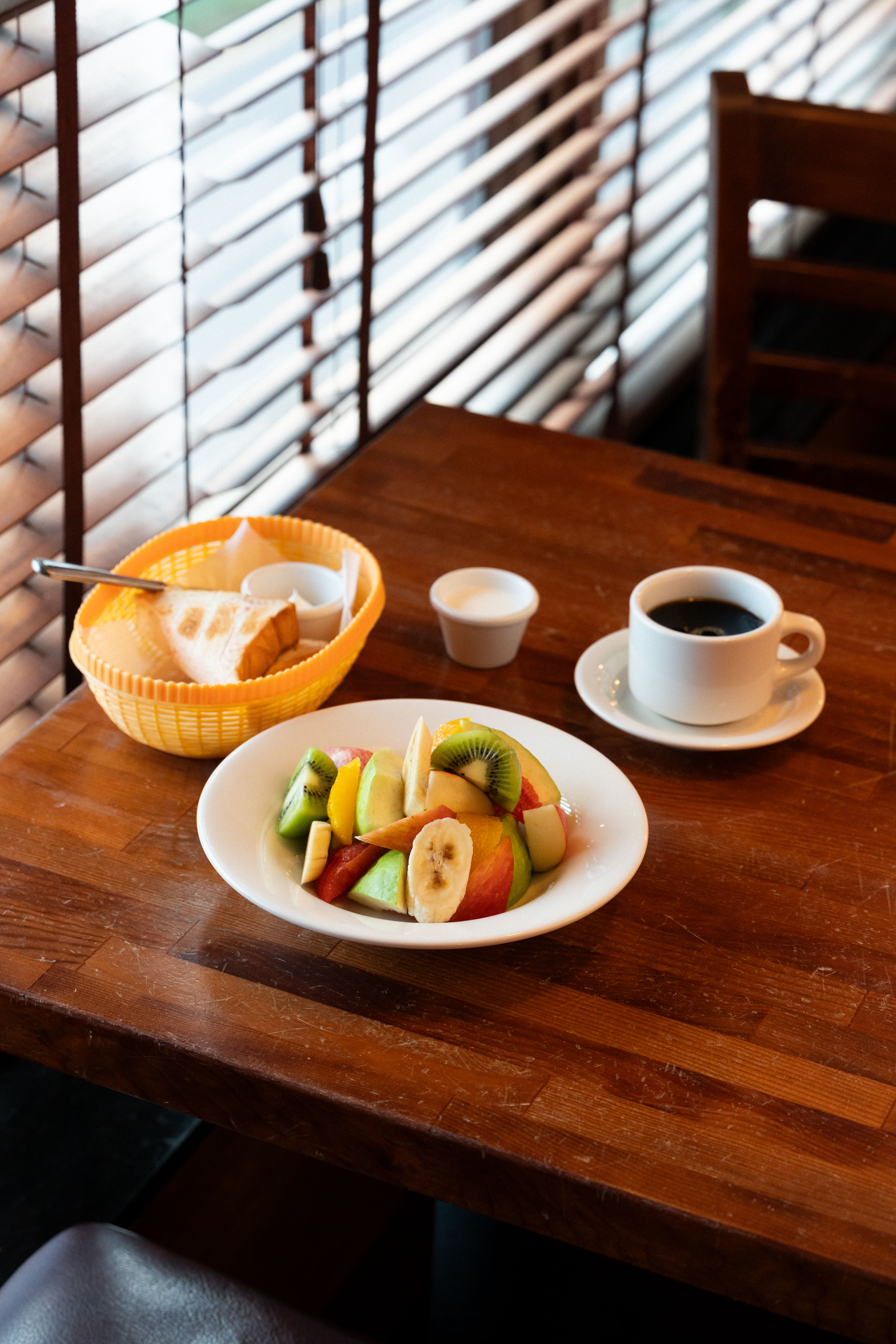 餐具選古瓷盤,咖啡杯要簡單線條,麵包籃刻意選塑膠材質,配上那種紅白格紋紙,「這張桌子,你一拍,我覺得那個情調可能在現在看起來會很不一樣。」咖啡是免費續杯的,而且廚房某些功能刻意拉到外面,一走進來就看到吧檯一直有咖啡在煮,聞得到,看得到,那個氣味和那個畫面,是整個空間體驗的一部分。鬆餅也是自己開發的配方。「不像美式,也不像日式,」他說,「就是一個只有我們的 Q 度。很 Q 然後很鬆軟,可以搭起司粉跟楓糖,也可以配炸雞,喜歡怎麼吃就怎麼吃。」