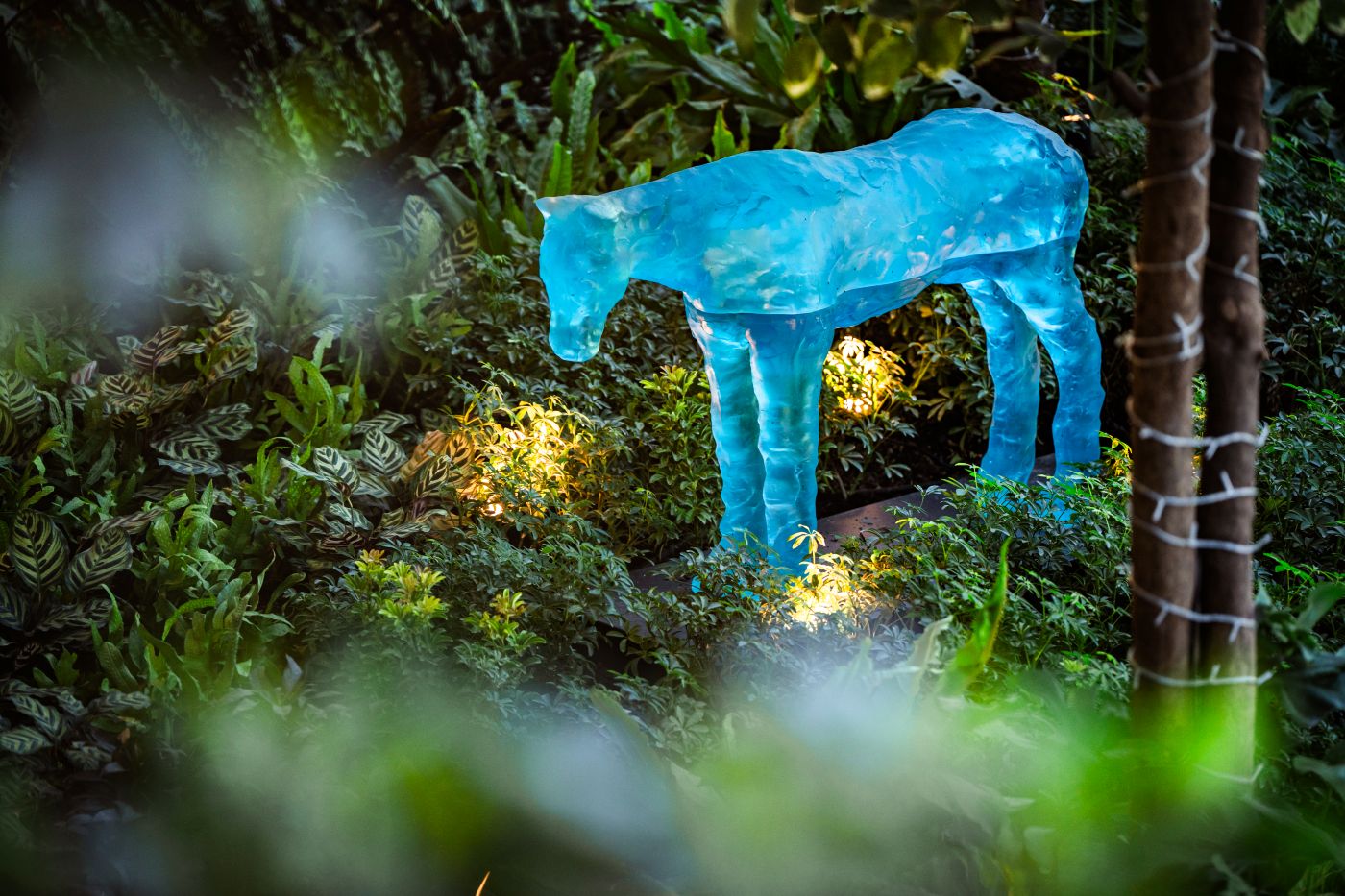 烏戈‧羅迪納 Ugo Rondinone 的作品〈西北海峽 Northwest Straits〉,以透明藍色玻璃鑄造了一批馬的形象,且由一條水平線分割,呈現出兩種不同深淺的藍色,馬的形體因而成為一種海洋景觀或陸地景觀的容器。(photo credit:漢來日月行館)