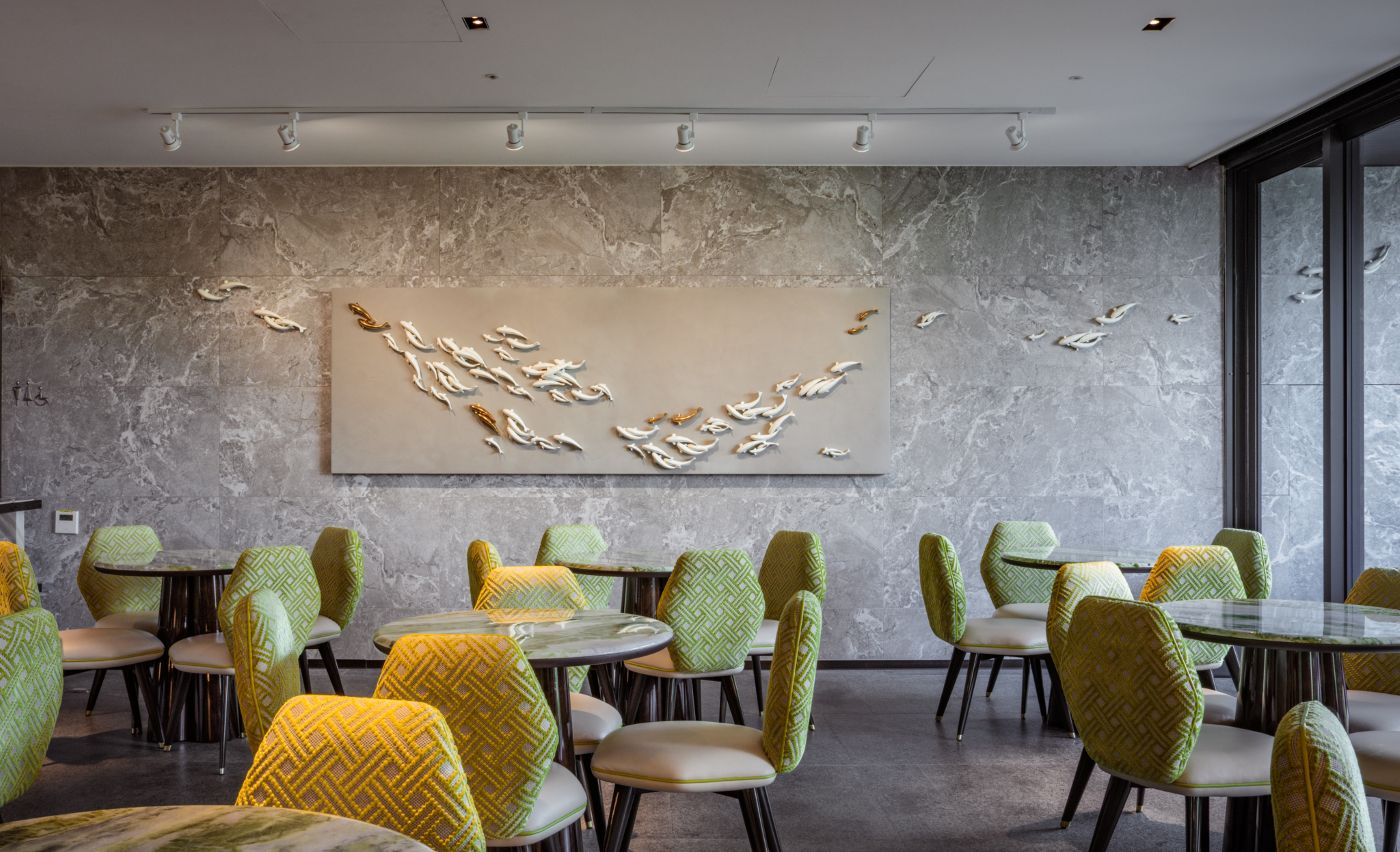 新收藏於漢來日月行館茶屋的〈自游自在〉,出自當代陶藝家劉子瑜之手。「魚」是劉子瑜創作中的重要元素,為空間呈現出自然的律動感。〈自游自在〉展示於茶屋的落地窗旁,劉子瑜提到,最初構想是悠游在日月潭廣闊水域的魚兒們,自室外的潭景游入室內,將意涵引入飯店之中,也呼應窗外自然景致,營造內外交融的美感。「安裝當天我臨時決定在外牆也加了幾尾魚。我覺得只要多了幾條魚,就能讓人感覺在一天的旅程探索後,隨著魚兒返回到飯店,既自由也能獲得平靜。」