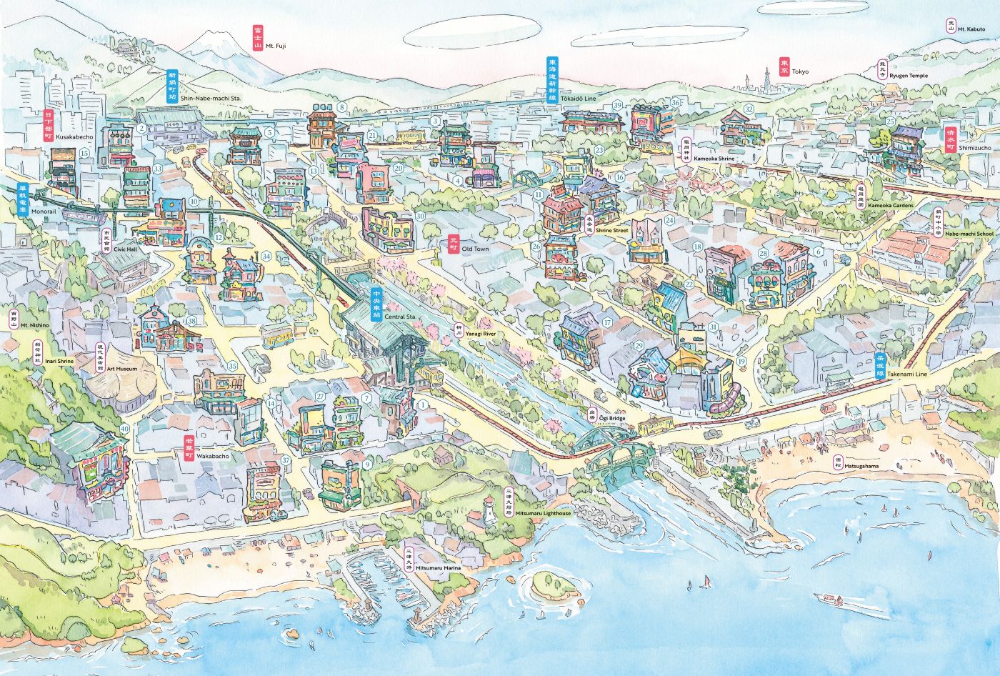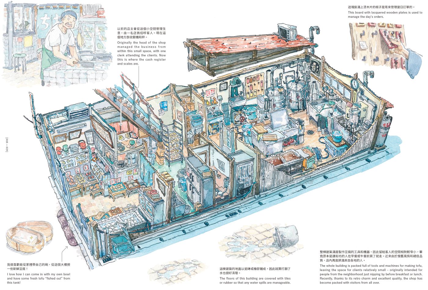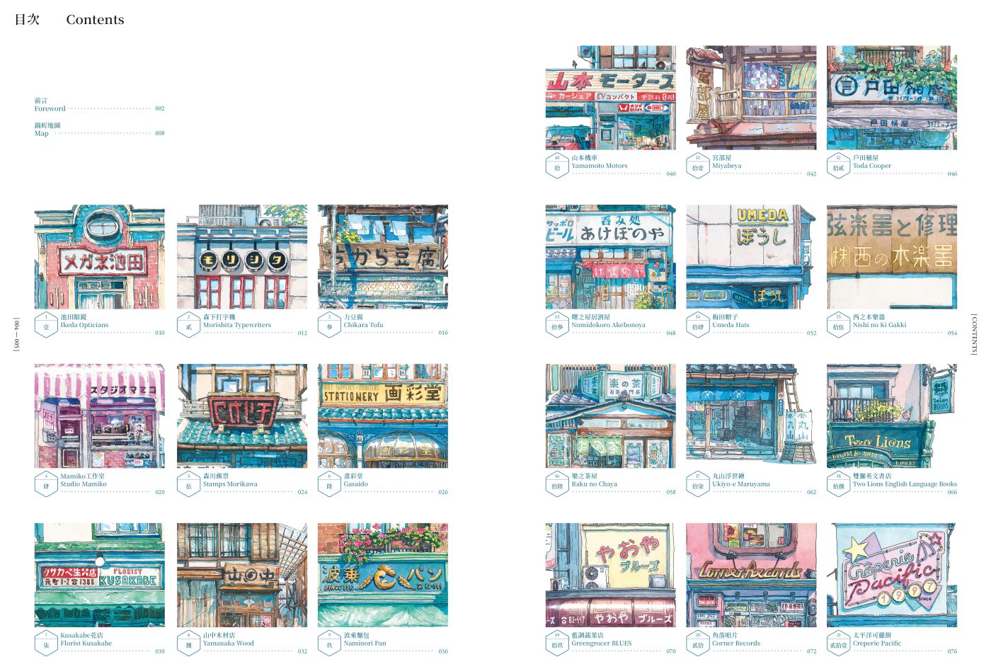 好想在日本地圖上,找到這座海邊小鎮──「鍋町」。然後,逐一走訪鎮上 40 間帶著日式懷舊風情的迷人老鋪,蔬果、洗衣、鐘錶、眼鏡、雨傘、鯛魚燒店……,親自見證那些在波蘭插畫家 Mateusz Urbanowicz 畫筆下所描繪的細節:那躍然紙上的空間質地、色彩與氛圍,那彷彿帶有時光厚度與故事的店鋪透視圖。難道,這一切真的都只是「空想」?