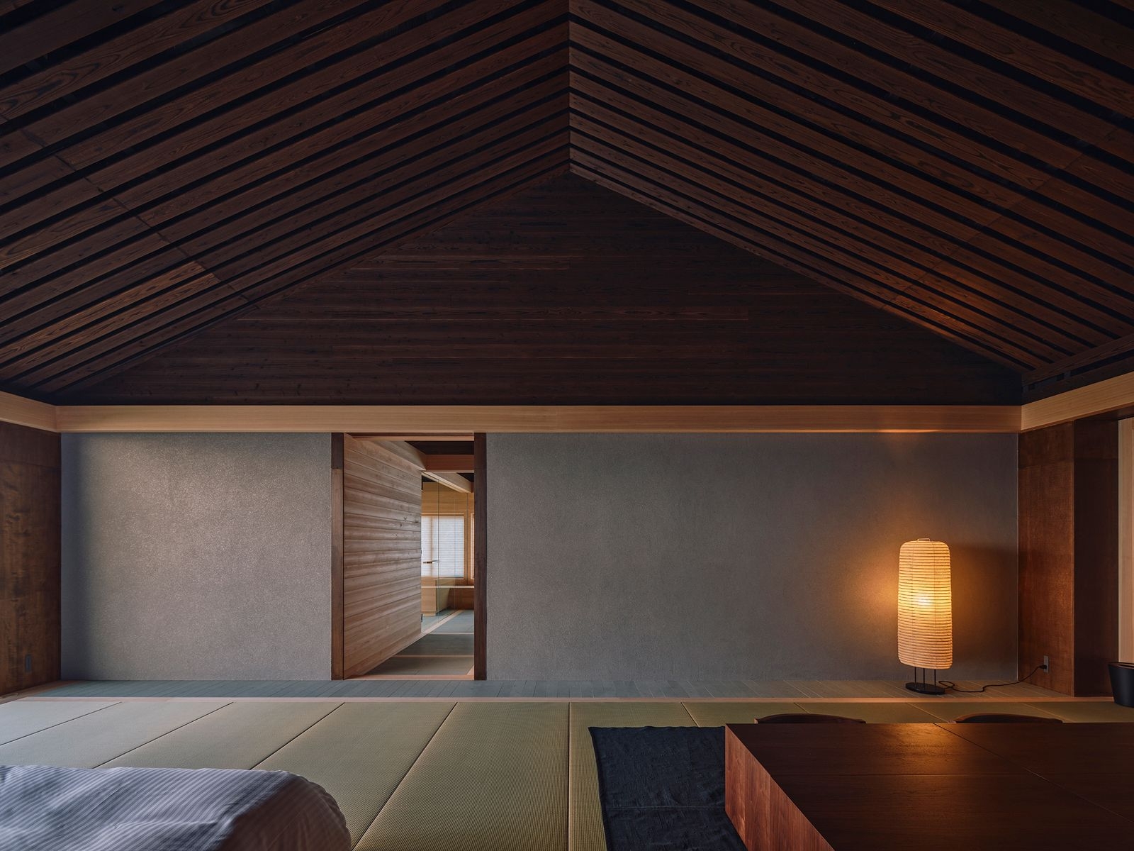 (Photo Credit:Takuya Seki)空間圍繞著「如何讓人自然看見海」展開,進入客房時,會先經過一段天井高度約 200 公分的踏入區,低矮的尺度讓情緒慢慢沉澱;推開以葦製作的紙拉門後,挑高約 4.6 公尺的客廳空間隨之展開,北側的大面開口將日本海完整引入室內。這樣的轉折就像引導,讓人不自覺地把注意力交給海。