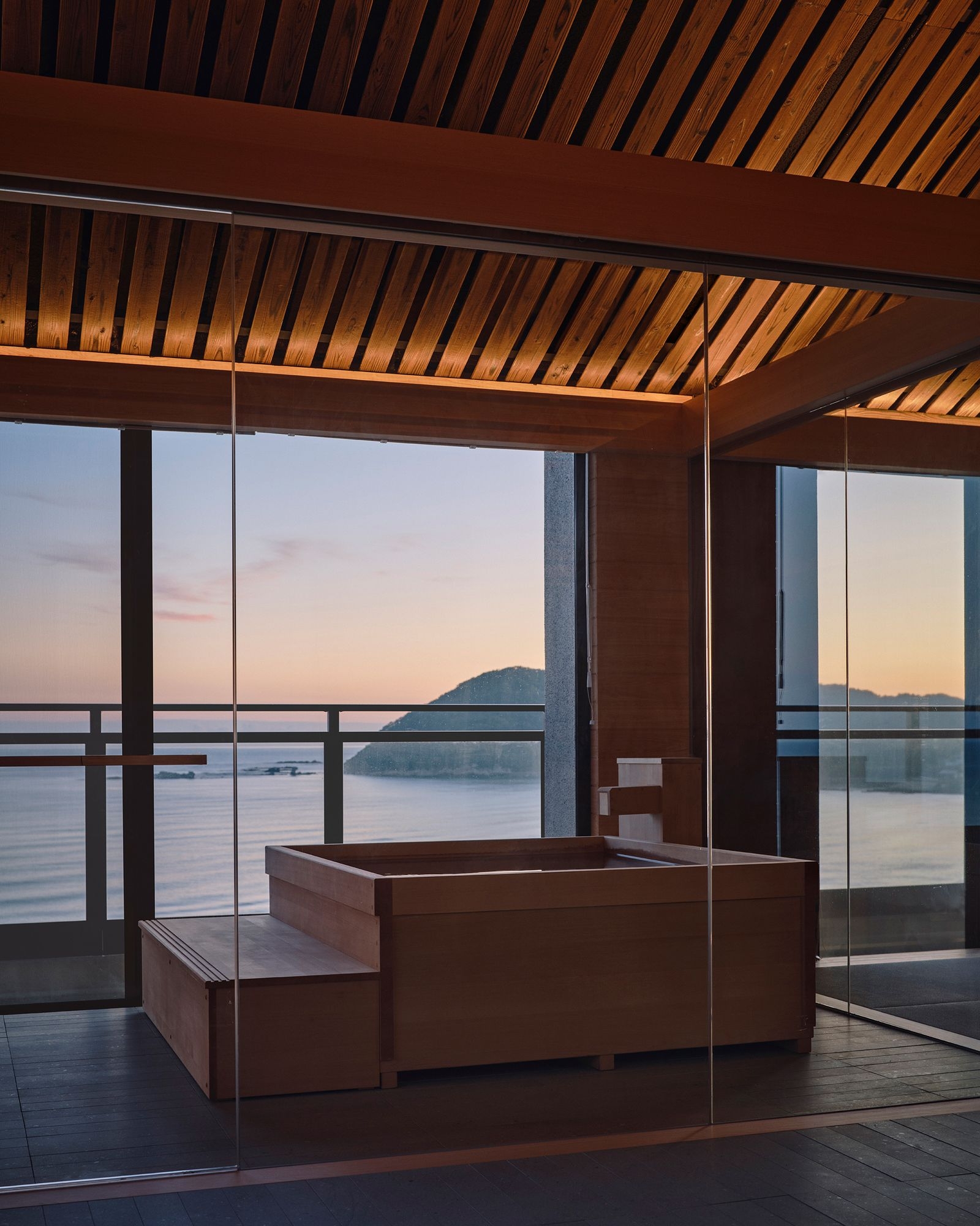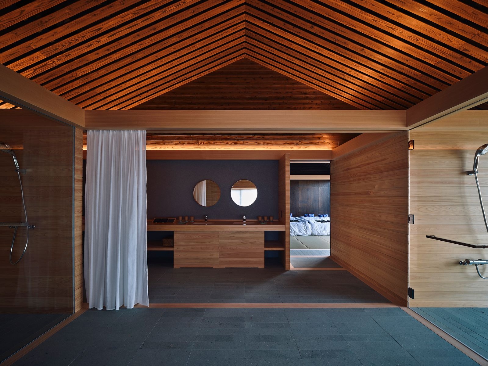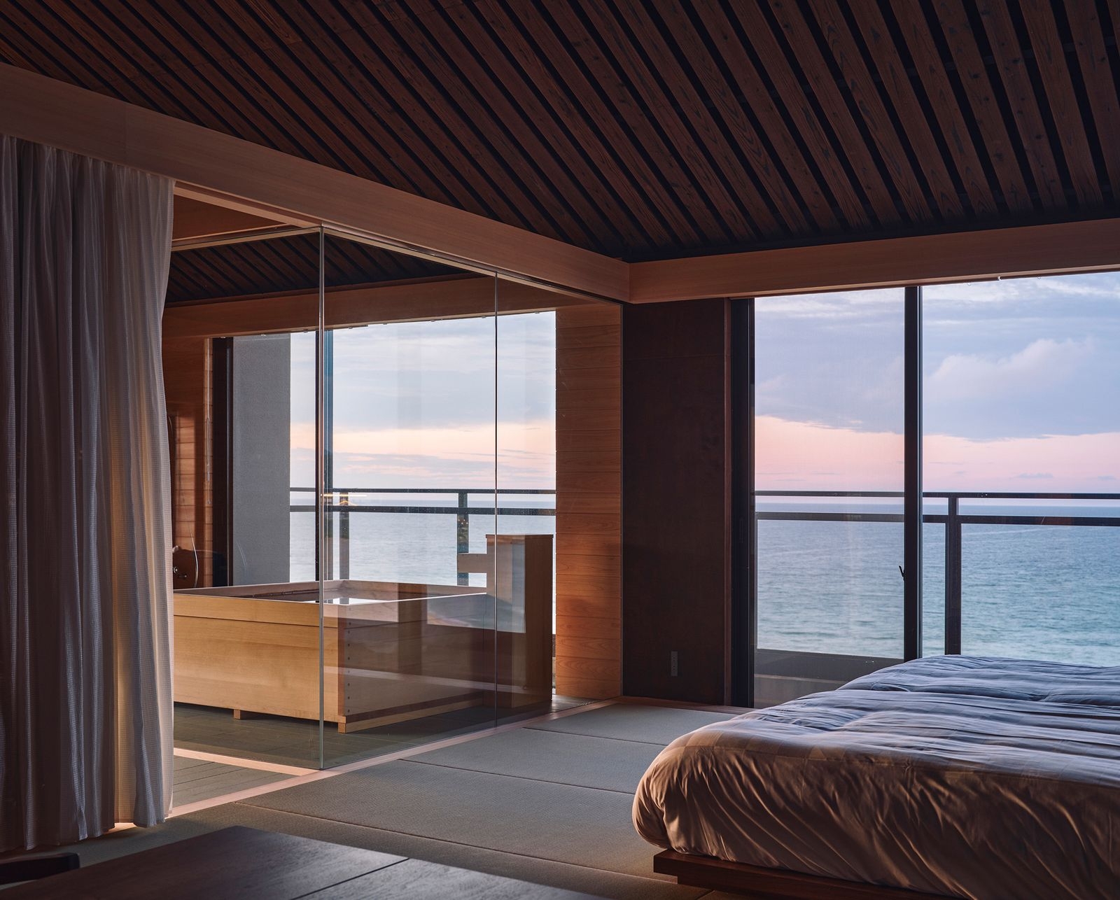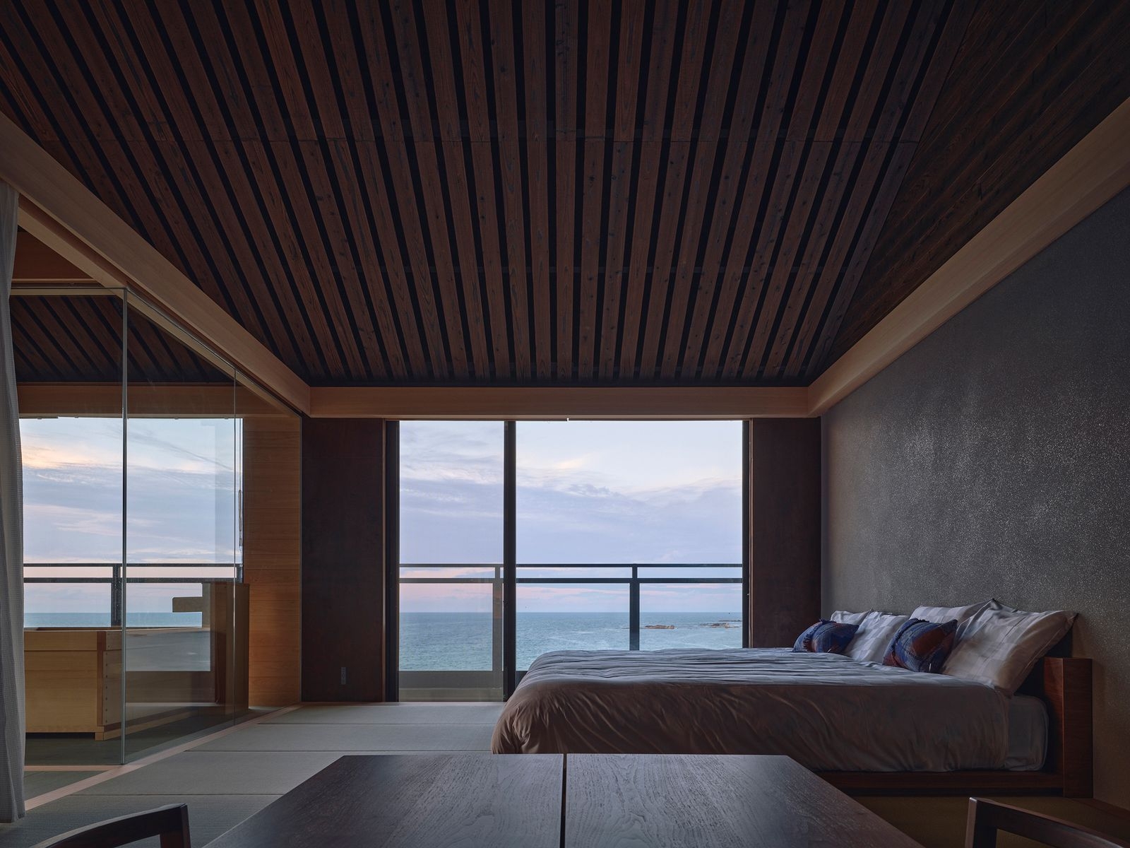 (Photo Credit:Takuya Seki)浴室延續整體的開放設計,打破傳統較封閉的配置。空間保留高度,以水平線條為主,讓人們在入浴時的視覺感受跟海面相互呼應,營造出貼近自然的放鬆狀態。天花板以燒杉木條排列,兼具耐濕與細緻光影;地坪選用吸濕性良好的十和田石,浴槽則以檜木製作,讓材質本身的觸感與氣味,成為體驗的一部分。