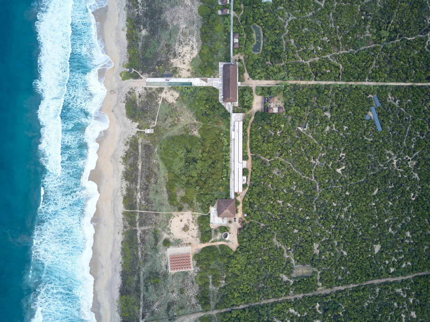 由墨西哥藝術家 Bosco Sodi 於 2014 年創立的 Fundación Casa Wabi,總部坐落於墨西哥太平洋岸瓦哈卡州 Puerto Escondido 的海岸邊。基金會的「Wabi」之名源自日本的「侘寂」美學,在簡樸、不完美與時間痕跡中尋找美感,這樣的精神也與 Sodi 慣用天然材料創作、讓作品隨時間產生變化的特色相呼應。他希望透過藝術、教育與基礎設施的投入,為家鄉帶來長遠的文化影響,這份心念也成為這座藝術園區誕生的起點。