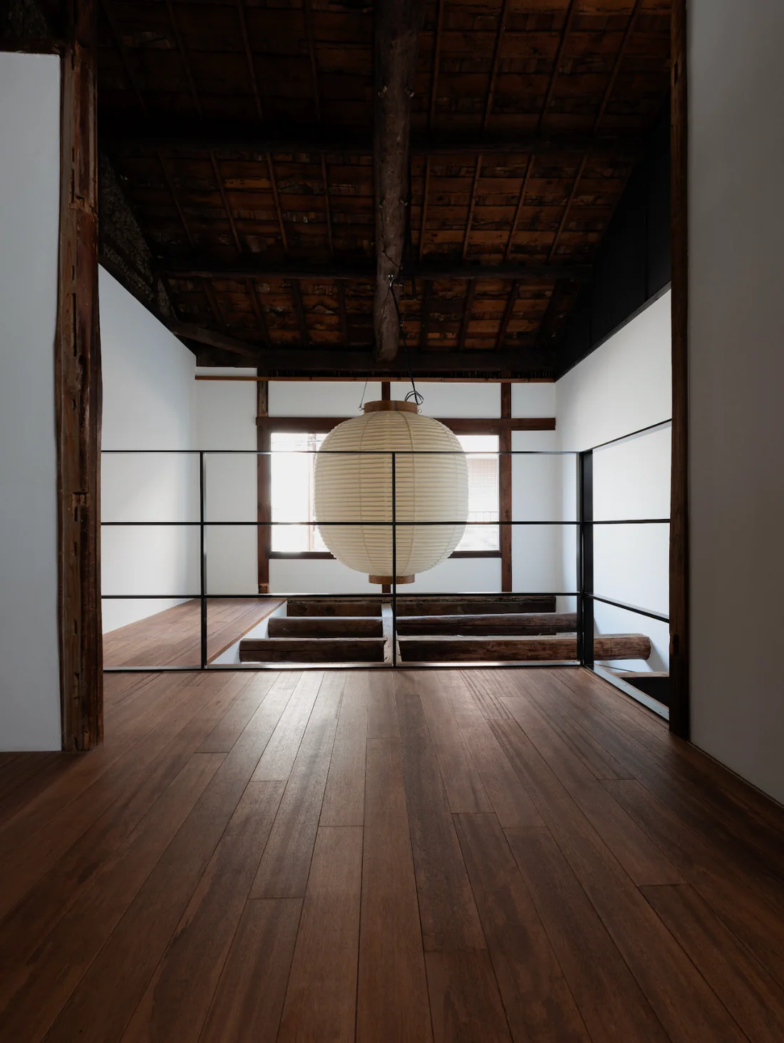 二樓則是作為親密尺度的鞋履選品區,一盞從天花板垂落的傳統和式大燈籠成為空間的視覺錨點。Studio Nicholson 在燈光配置上刻意混搭燈箱與此件燈具,使光線既均勻又保有溫度。