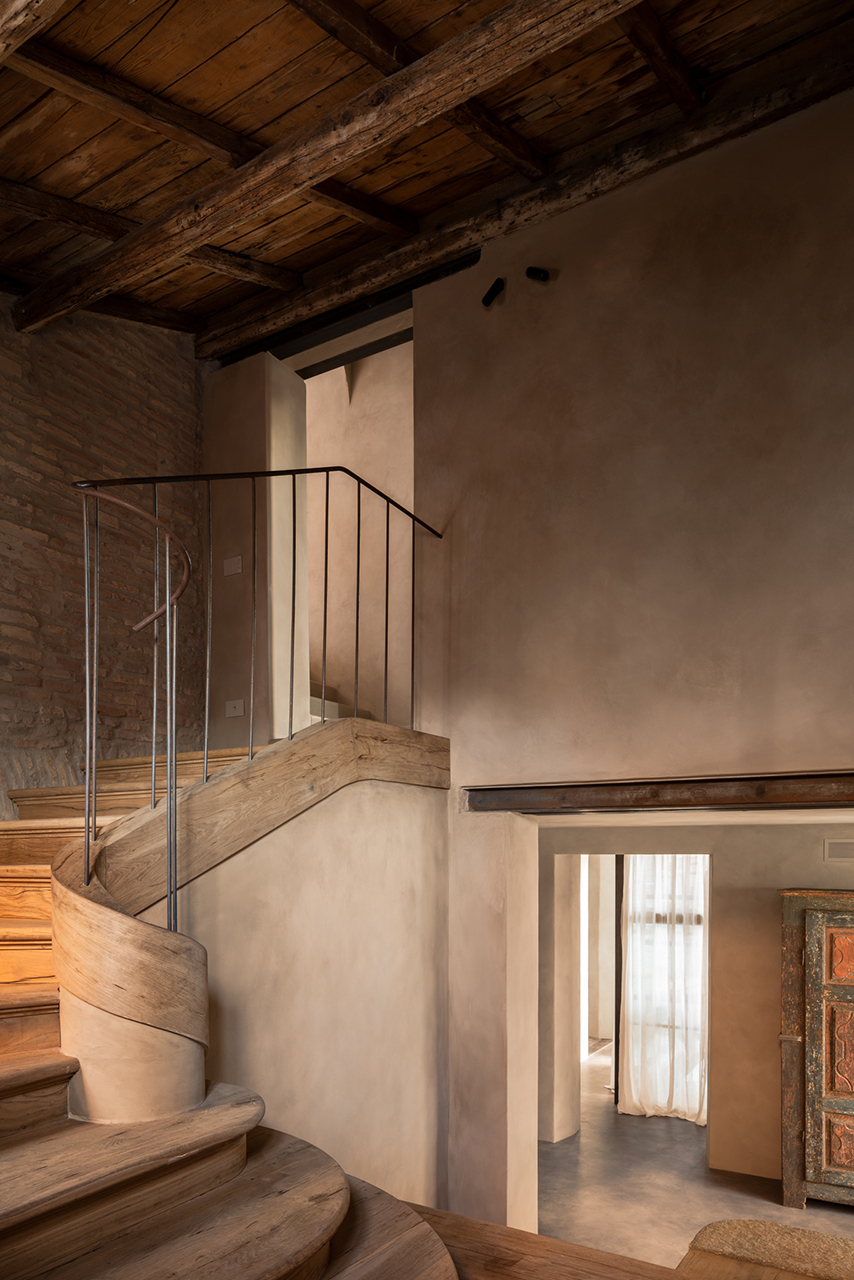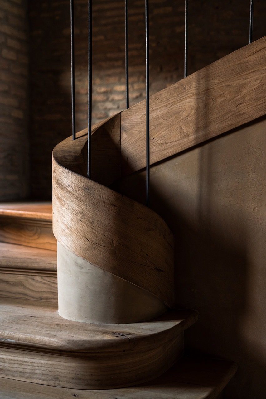 橫跨兩個樓層、室內面積 350 平方公尺,另有 140 平方公尺露台的公寓,完整保留了木製天花橫樑與拼花木地板,讓建築原有的時間感成為基底。所有門扇、木製餐桌與長凳、石製洗手台、拱頂壁龕,以及通往露台的螺旋樓梯,都是被保留再利用的舊有元素。新增家具與細部由在地工匠量身訂製,部分軟裝選自以侘寂美學聞名的比利時設計師暨古董商 Axel Vervoordt。地暖系統與空調設備則以隱蔽方式整合,讓空間在視覺上維持簡約,也能符合現代的生活需求。