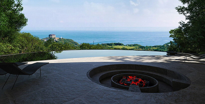 在平面配置上,Steven Chu 沒有以傳統「房間」為單位,而是以一連串「過渡空間」來組織整體。核心是一個圓形露台,中央設置下沉式火爐,成為主要的生活與聚集場域。視線向外延伸,可以望向遠方海景,也能同時感受森林的包圍。