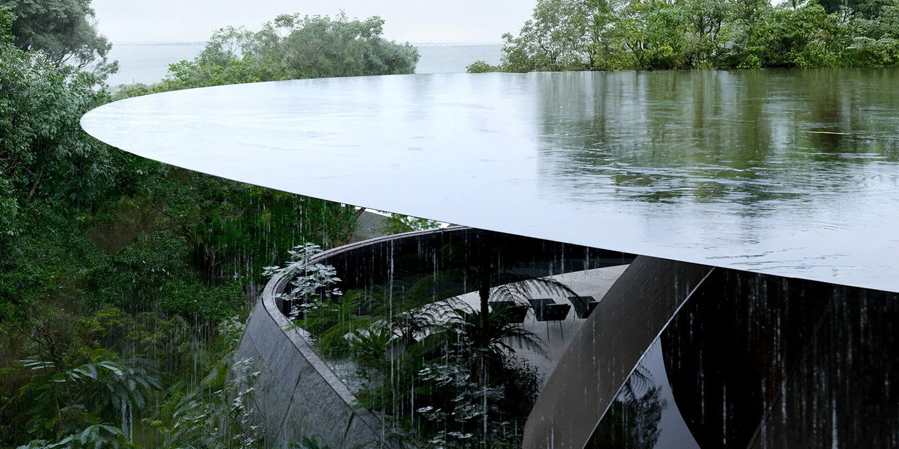 整體設計最鮮明的,是一座如碗狀般向內收束的大型屋頂。它懸浮於空間之上,將落下的雨水匯集,再沿著邊緣緩緩釋放。水流沿著屋簷形成一圈連續的雨幕,模糊了室內與戶外的界線,也讓「邊界」變得不再那麼明確。