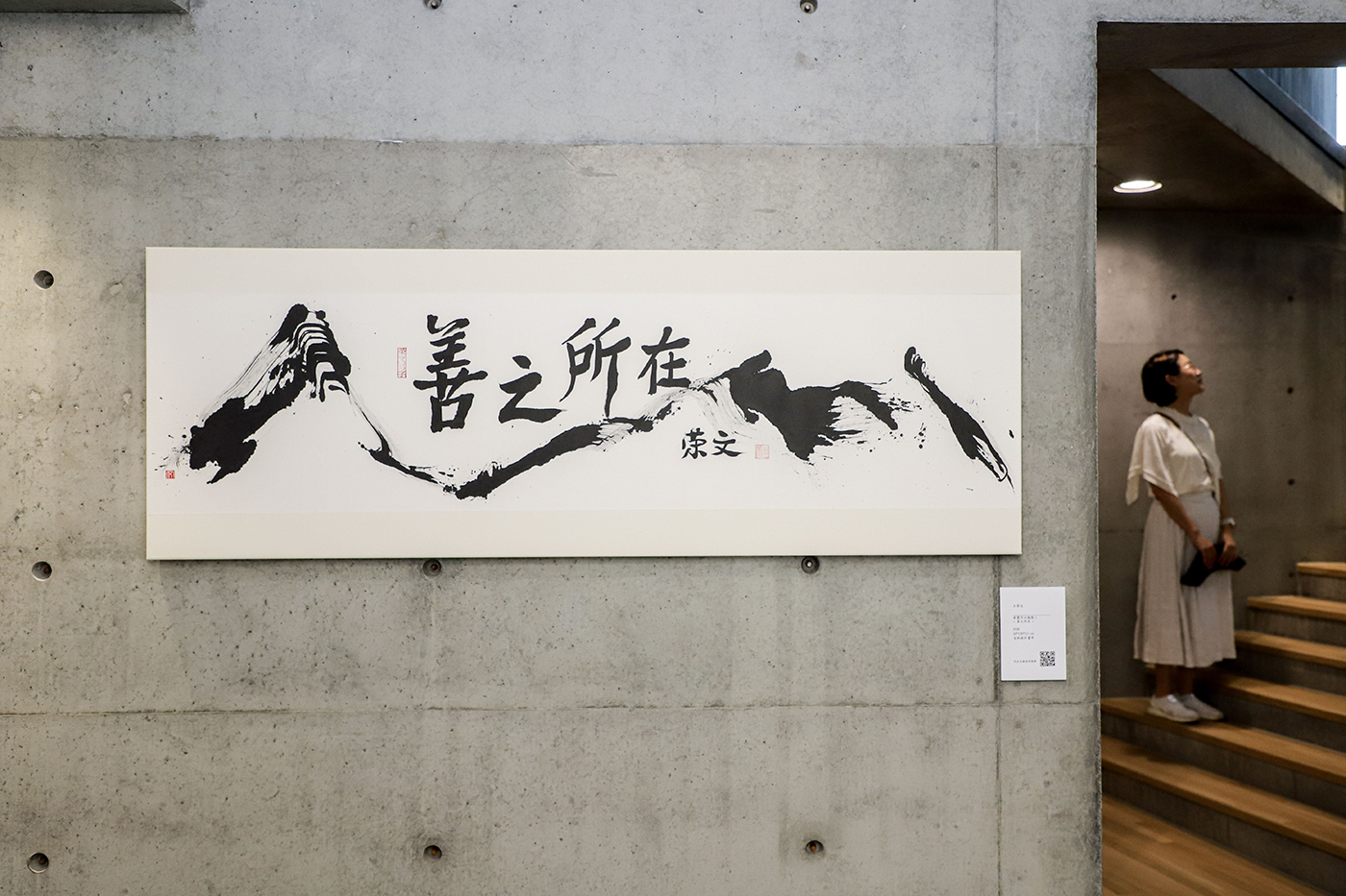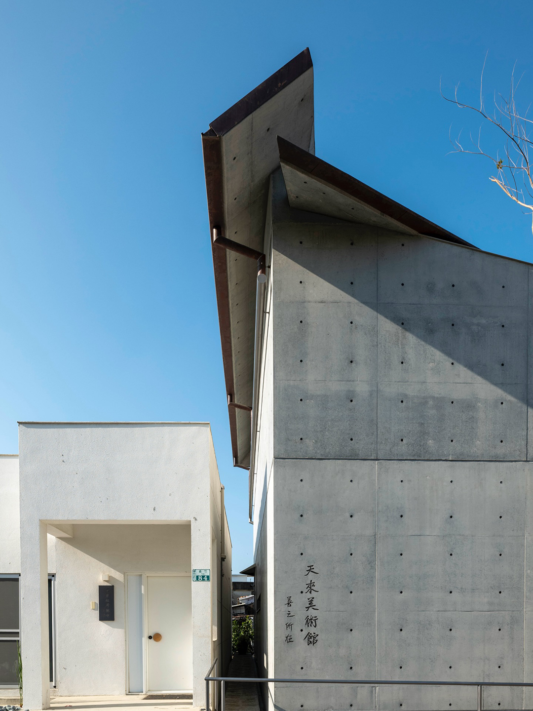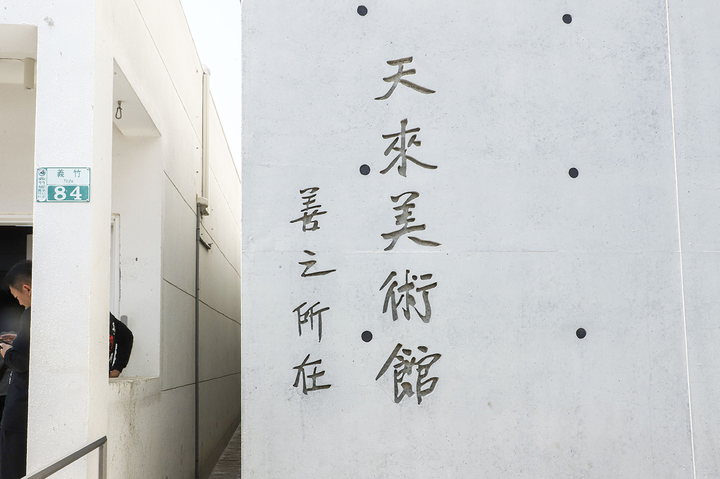 從外觀望去,建築以清水模為主體,屋頂覆以銅片,拼構出不規則的「斗笠」輪廓,將農夫的生活風景融進建築造型,形塑出簡潔而沈穩內斂的氣質。側面牆上刻有的「天來美術館 善之所在」九字,則像是一道精神座標,安靜地訴說著這裡的來歷。