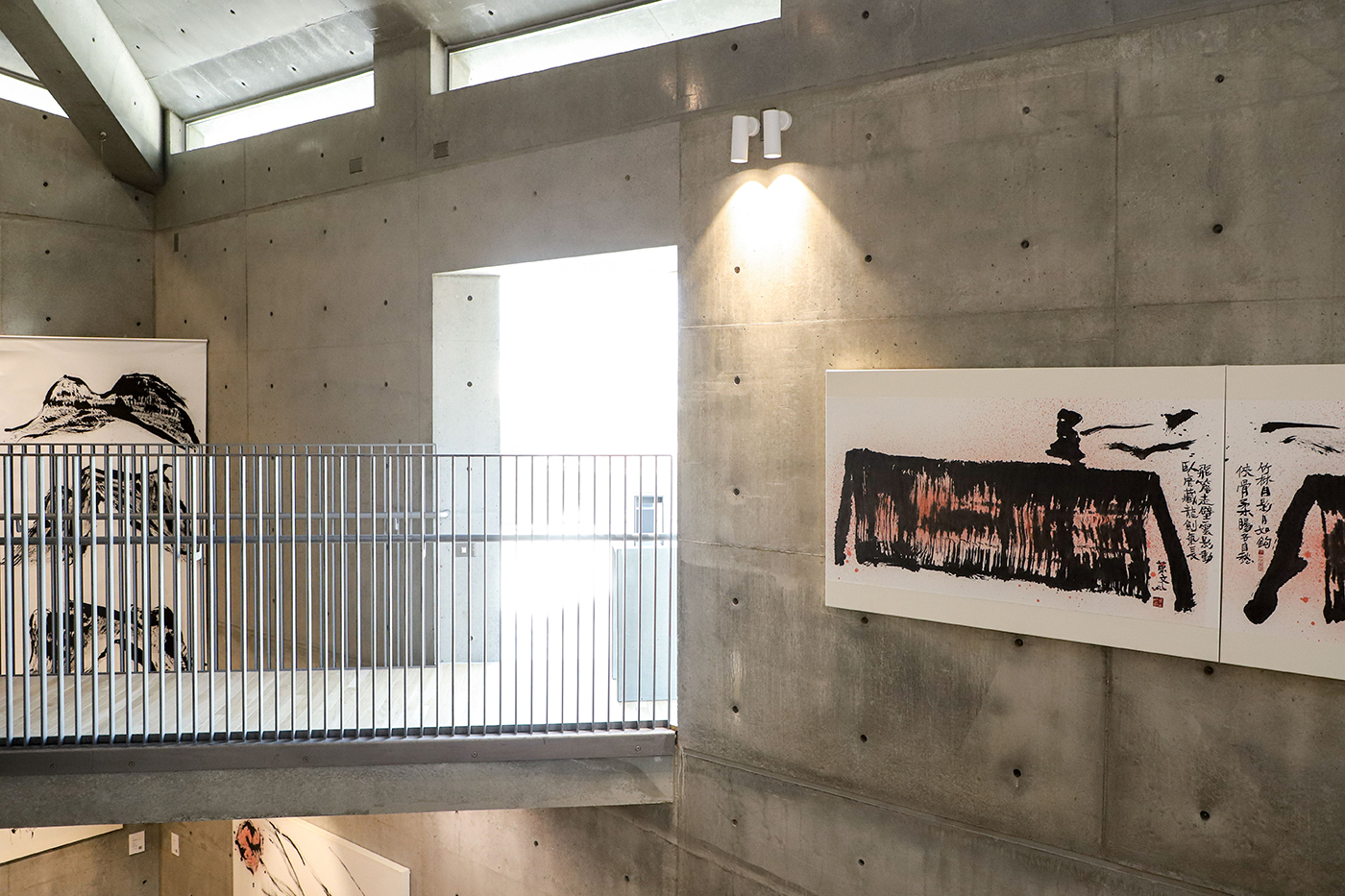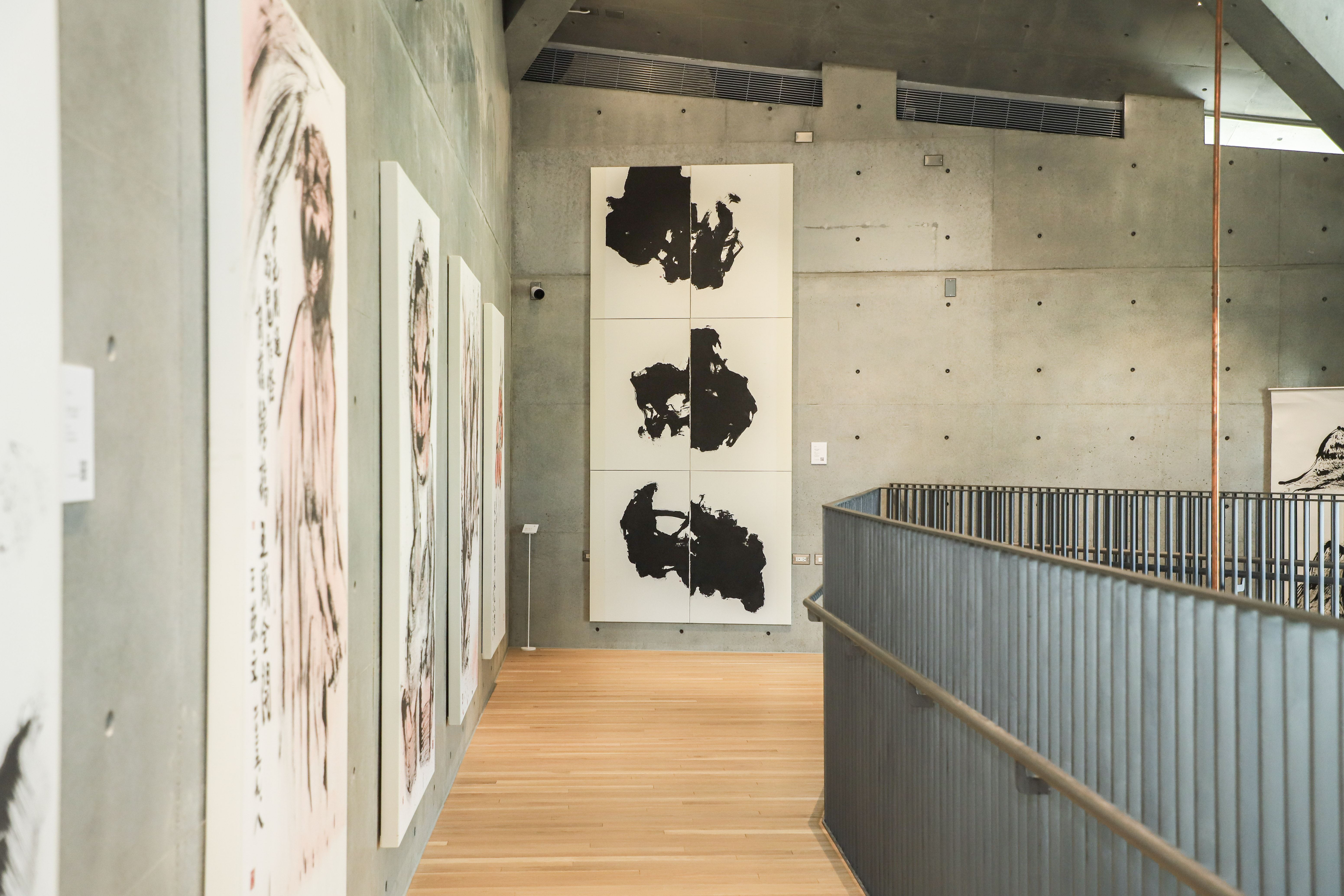 這樣的理念,具體體現在王榮文攜手臺灣現代藝術書畫家程延平推出的開館首展中。師承抽象藝術先驅李仲生的程延平,以大寫意與潑墨筆法聞名,長年在山林間生活,作品揉合東方水墨精神與現代抽象語彙,尺幅宏大、氣勢奔放。相對之下,古稀之後的王榮文是在美術館的籌備期間,才第一次拿起畫筆,76 歲的他捨棄傳統筆墨,改以掃把、刷子等日常工具揮灑,畫面充滿直接而原始的生命感。