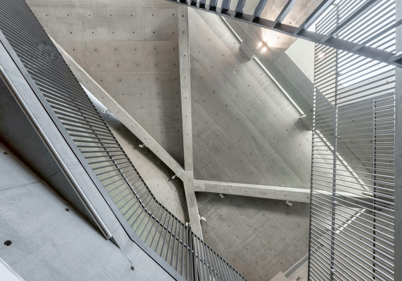 穿過狹道進入室內後,空間卻豁然展開,毛森江巧妙翻轉了原本有限的舊農舍格局,將其化為通透流動的場域。動線引導觀者拾級而上,走向二樓平台與三角形迴廊,在極簡幾何構圖中,感受光線在灰階清水模牆面上的游移,也讓人不自覺放慢步調,與空間一同呼吸。