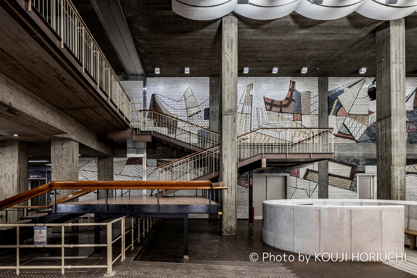 走入室內,歷史的線索處處可尋:1 樓大廳 OMO BASE 中,重現了昔日市會議場的圓形吊燈元素;過去標誌性的市民廣廳大階梯被重新構築為串連 1、2 樓的動線,村野藤吾常用的流線扶手也在其中復活,以原木材質再度現身。在麵包店 OMO Bakery 的牆面,則原地保存了雕刻家辻晉堂所創作的泰山磁磚浮雕〈海‧波‧船〉,它過去是被裝飾於舊市長室入口。