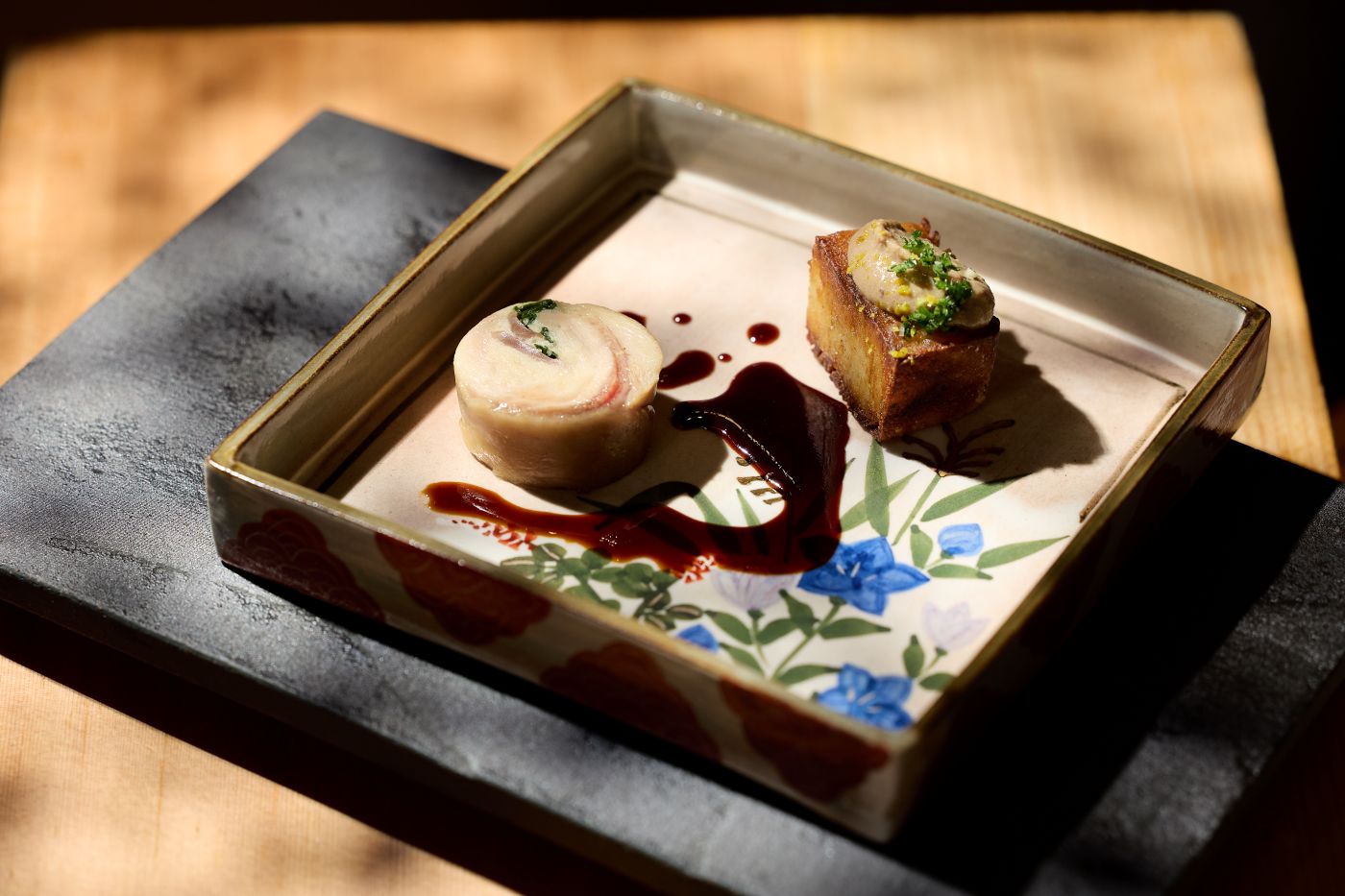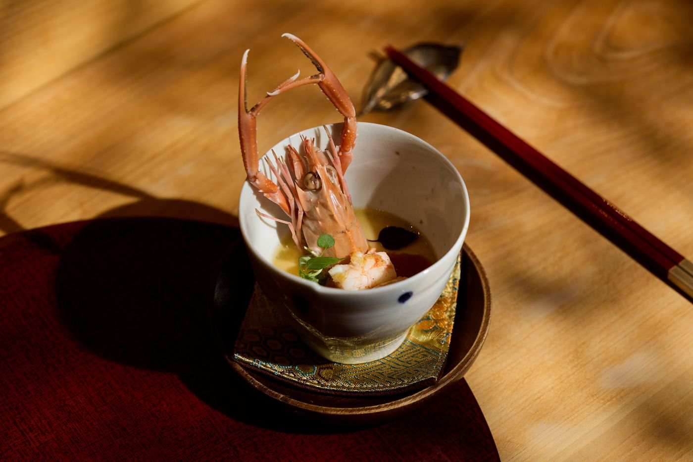 這道玉子蒸突破傳統茶碗蒸以柴魚高湯為主體的做法,加入細磨豆漿,使得質地更加柔滑細膩。飾以去殼的整隻赤座海老,搭配由蝦頭與蝦膏慢熬而成的鬼殼醬,散發淡雅香氣的玉子蒸,與新鮮海老完美搭配,悅目又舒心。