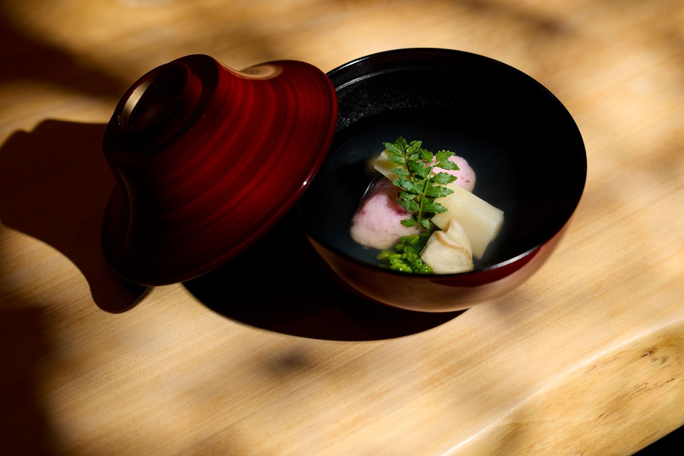 揭開椀蓋的瞬間,清雅香氣先行迎面而來,接著再啜飲熱湯,感受湯液帶來的溫暖包覆。沉浸於湯裡的羽二重真丈,如絲綢般柔嫩,特以甜菜根染為櫻花色呼應季節。搭配鮮甜肥碩的當季白蛤,還有散發特有清新香氣的木之芽,酥脆米果增添口感層次,整道湯品浸溺於清香,口感在柔軟與微脆之間帶來變化。