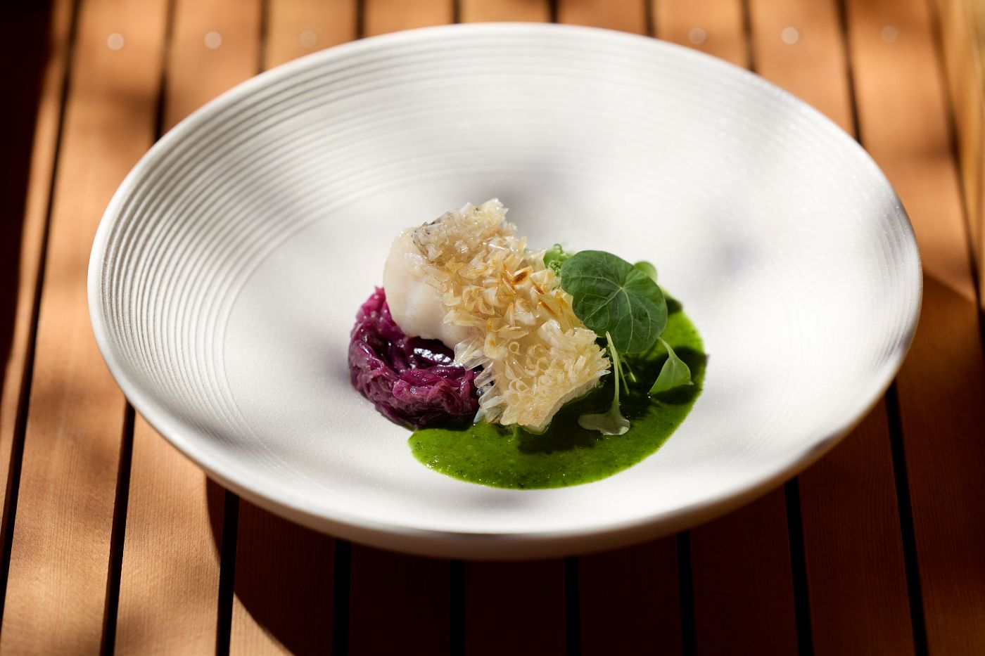 燒物選用肉質細緻的深海旬魚,以鹽簡單調味,透過立鱗燒等技法將魚皮烤至酥脆,突顯食材的自然鮮甜。盤中搭配帶有紅酒與紅酒醋酸香的紫高麗菜,以及清新的翠綠野菜醬,形成味覺與色彩的對比。整體擺盤帶西式風格,讓視覺更為開放與自由,但料理核心仍遵循日式技法,呈現二階料理一貫的跨界平衡。