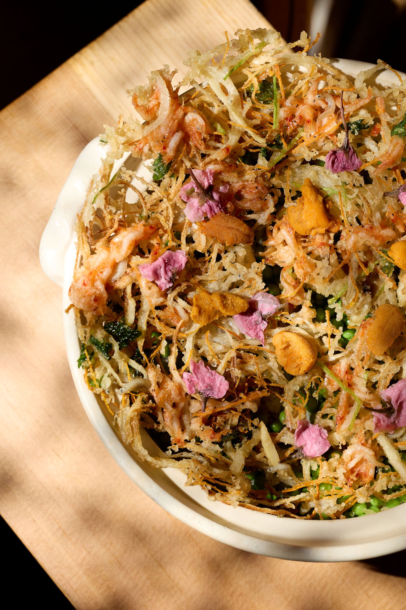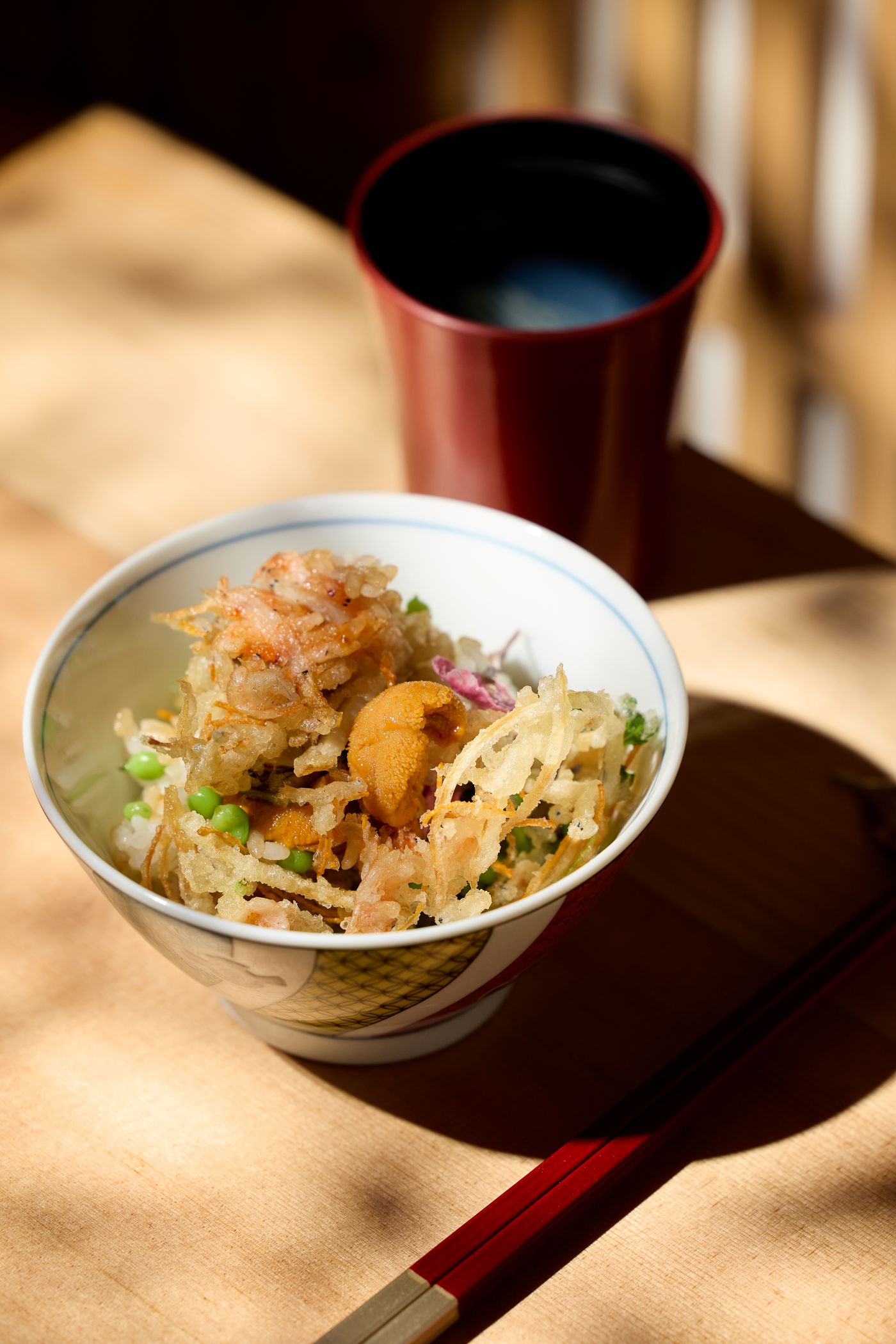 靈感來自日本賞櫻時常見的海鮮煎餅小吃,轉化以天婦羅形式重新演繹。本次運用日本獨特的炸技「搔揚」,將多種當季小型海鮮與蔬菜細緻切配後入鍋油炸。所謂「搔揚」,是將食材以手勢輕輕搔散入油中,使其在油鍋中自然凝結成型,不論下起鍋時間或油溫判斷都相當考驗料理技術。外層酥香輕盈,內裡仍保有海鮮的鮮甜水分,再鋪上海膽與青豆,成就一碗口感豐富的釜飯,走過一整套料理,帶來悠閒愜意的滿腹感,為整席料理作結。