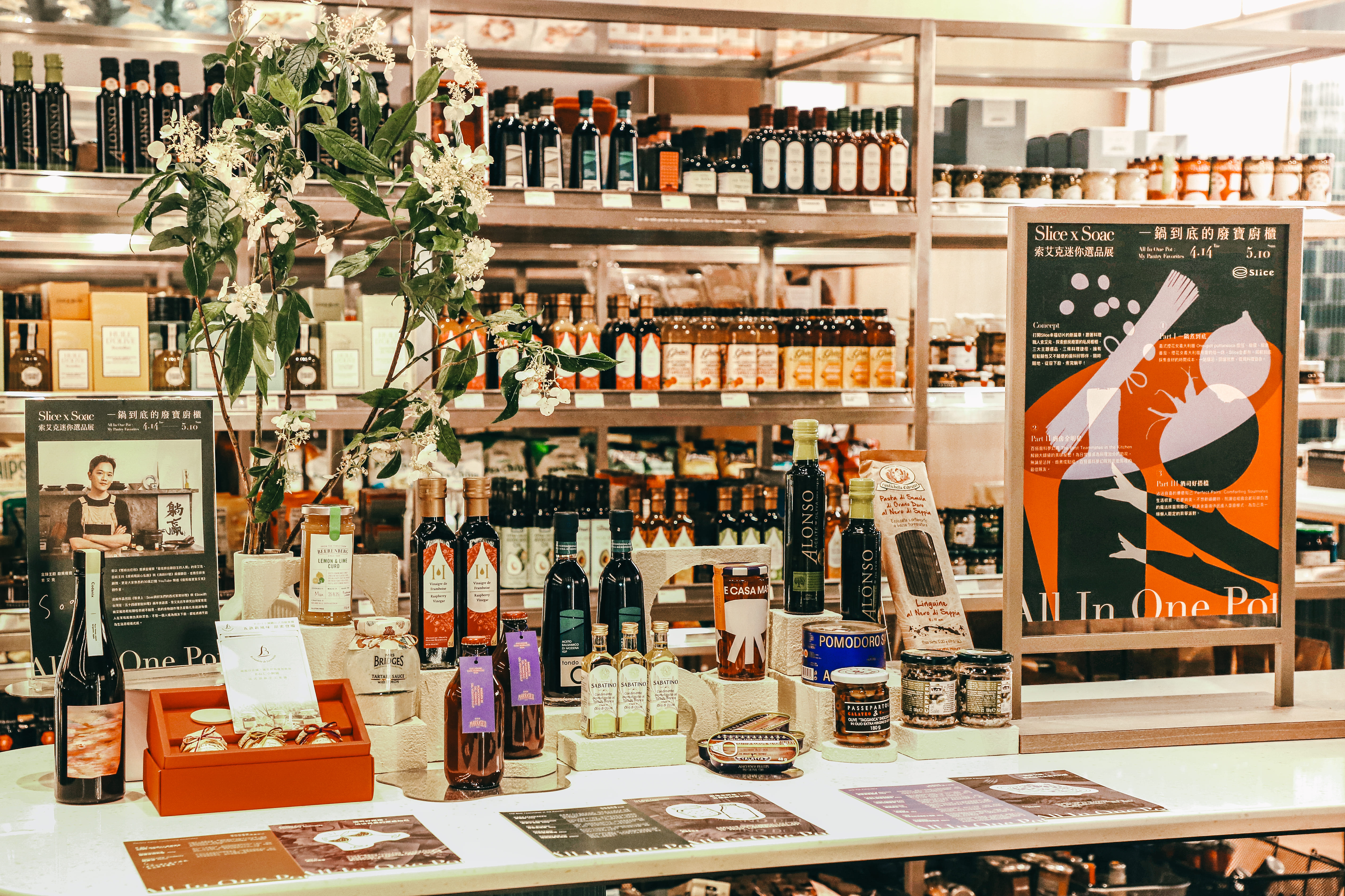 對歐陸食材感興趣、但進了店就不知道怎麼搭的人,這次也有人帶路。Slice 邀請金鐘主廚索艾克 Soac 策劃迷你選品展《一鍋到底的廢寶櫥櫃》,以「一鍋到底」為主題,設定三種料理情境,包含義式煙花女義大利麵、百搭醬料組合、起司麵包佐酒,從店內挑出對應食材,提供一種具體的入門路徑。
